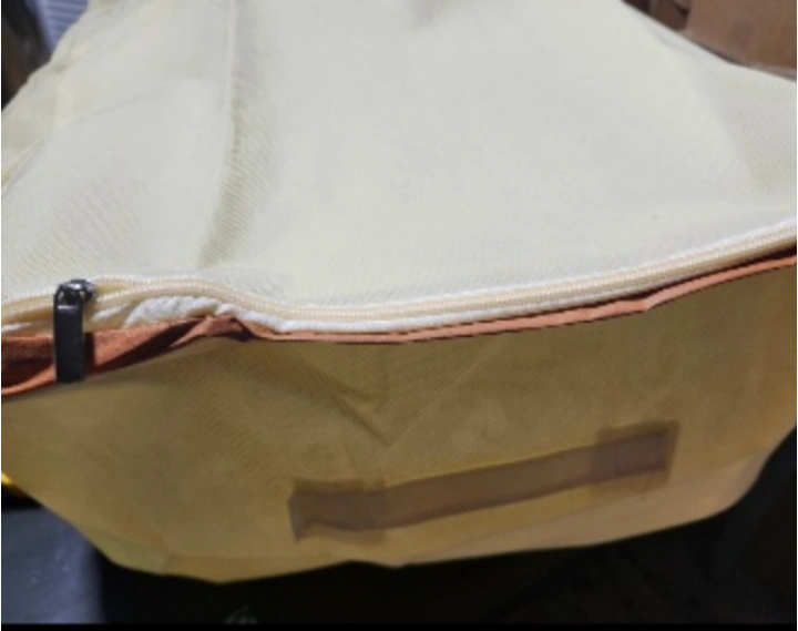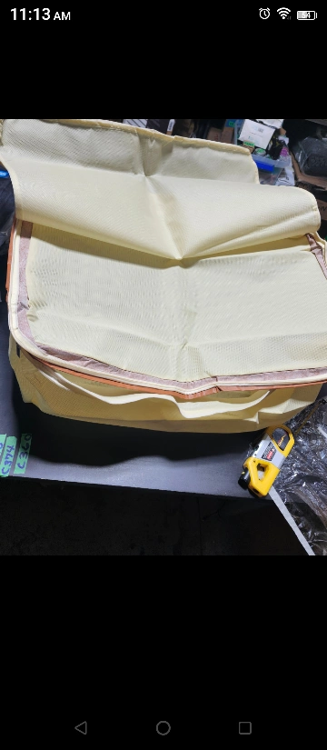 A light-coloured bag with a zipper. Appears to be a soft material. Can be used for storage of just about anything. Storage organizer lg 26Lx20Wx12H breathable fabric extra tall 2 zippers with handles has 3" storage on top