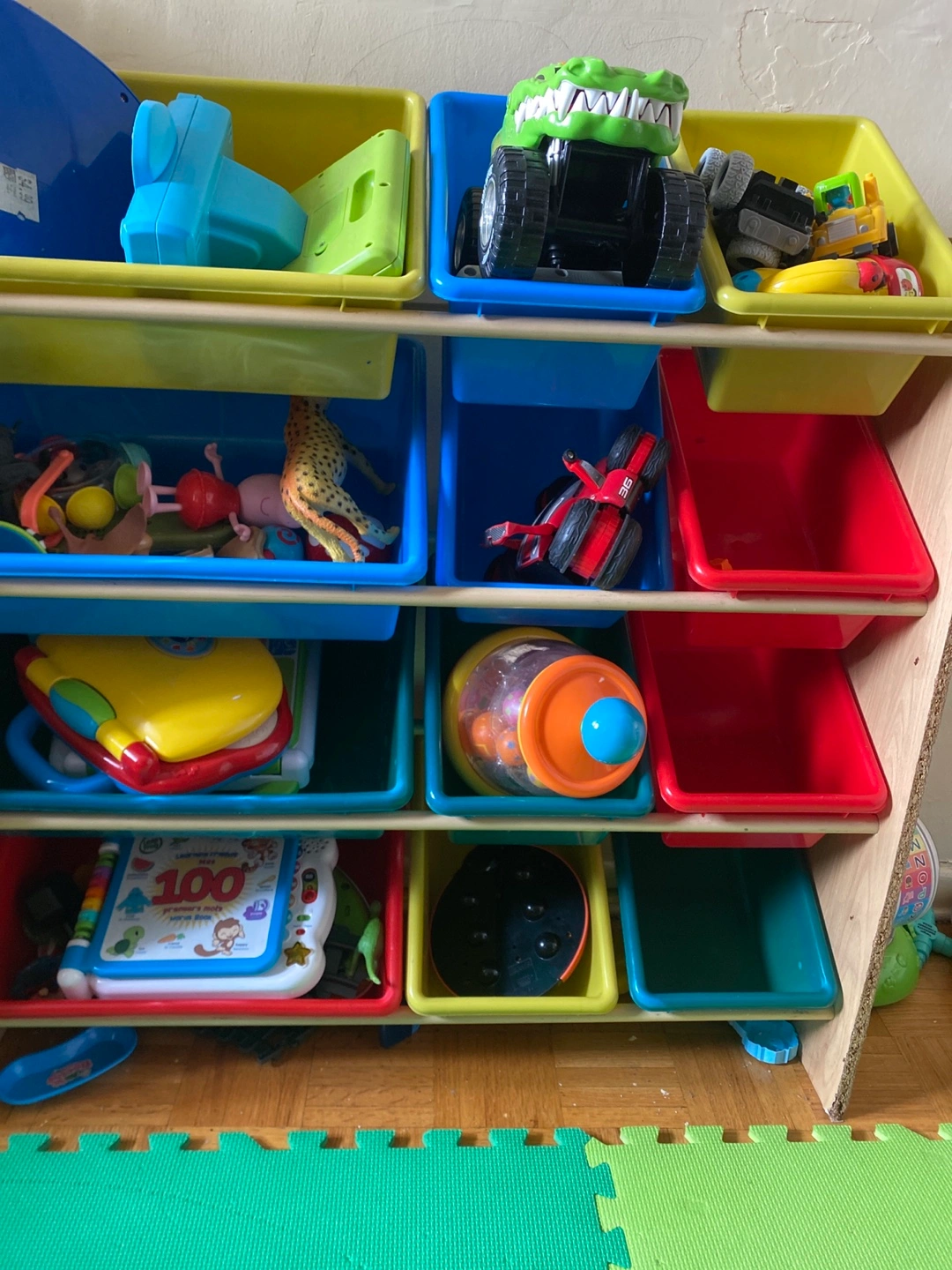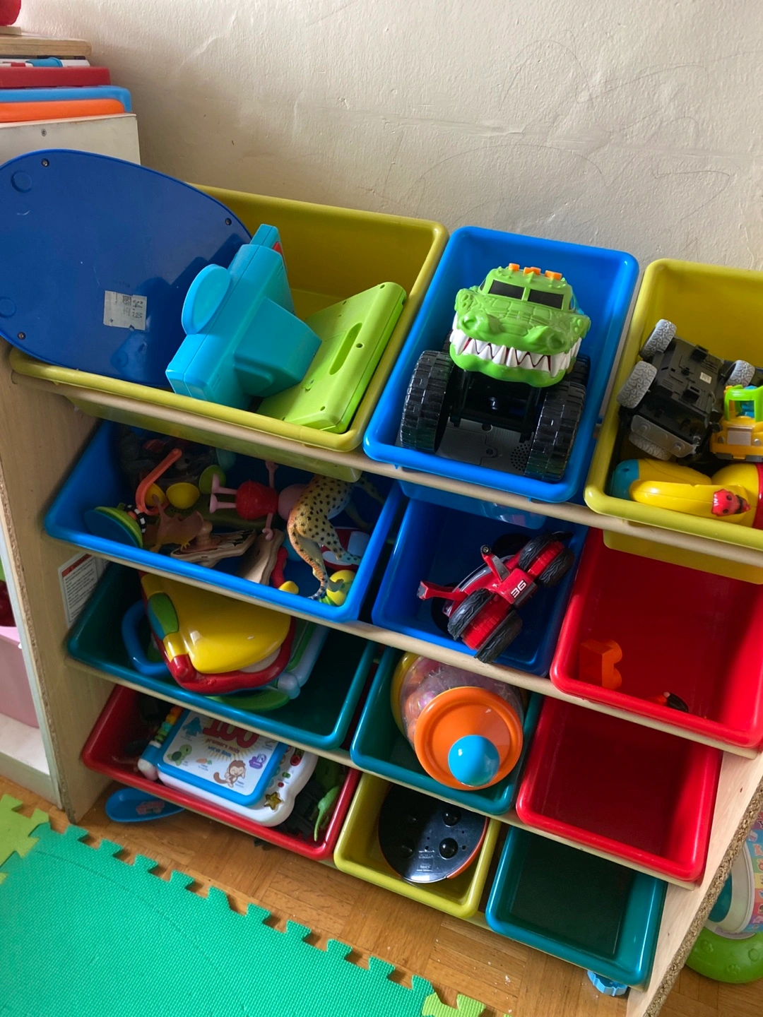 A multi-tiered toy organizer. It has multiple colourful bins. These bins are different sizes and colors. Perfect for keeping your child's toys organized and their play area tidy.