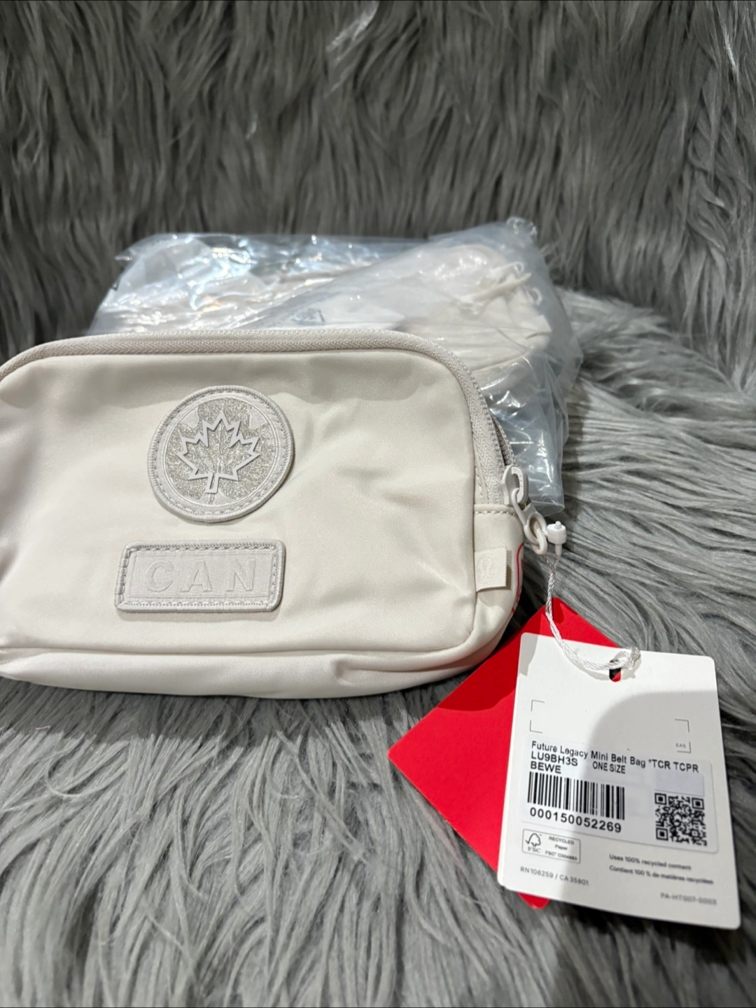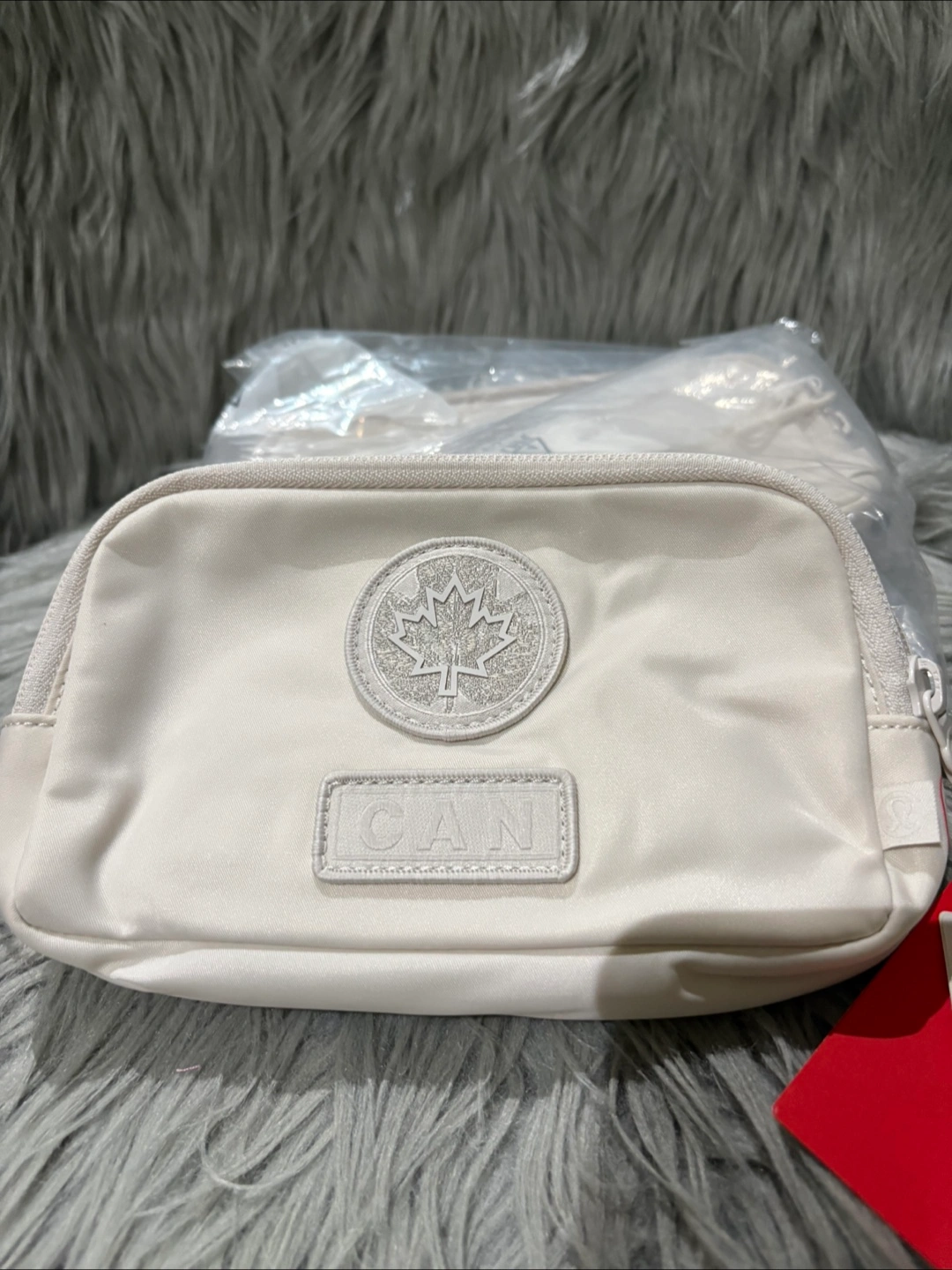 Features a zipper closure. Includes a strap with a buckle closure. Has a maple leaf emblem. This versatile bag is perfect for keeping your essentials close at hand, allowing for peace of mind throughout your day. 20 each