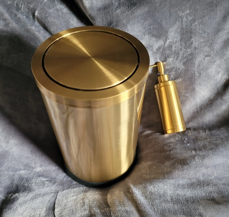 The set includes a trash bin(12.5" tall) and a soap dispenser(8" tall). Both are gold in colour and made of stainless steel. The trash bin features a silent, soft push design. Add this set to your bathroom for a touch of elegance! Barely used, very easy to clean. Retails full price new for over $100. Pick up only, Don Mills and York Mills area. Details for rubbish bin: -BEAUTIFUL CHAMPAGNE GOLD Titanium wire drawing – Elegant, fingerprint-proof, smudge-resistant Rose Gold Stainless Steel is easy to clean. -PREMIUM FEATURES – Removable Inner Bucket, Fingerprint-Proof , Rubber Pads on Non-Skid base,Mute flip cover,Titanium wire drawing process -The swing lid opens easily with a slight push and then gently swings back into place