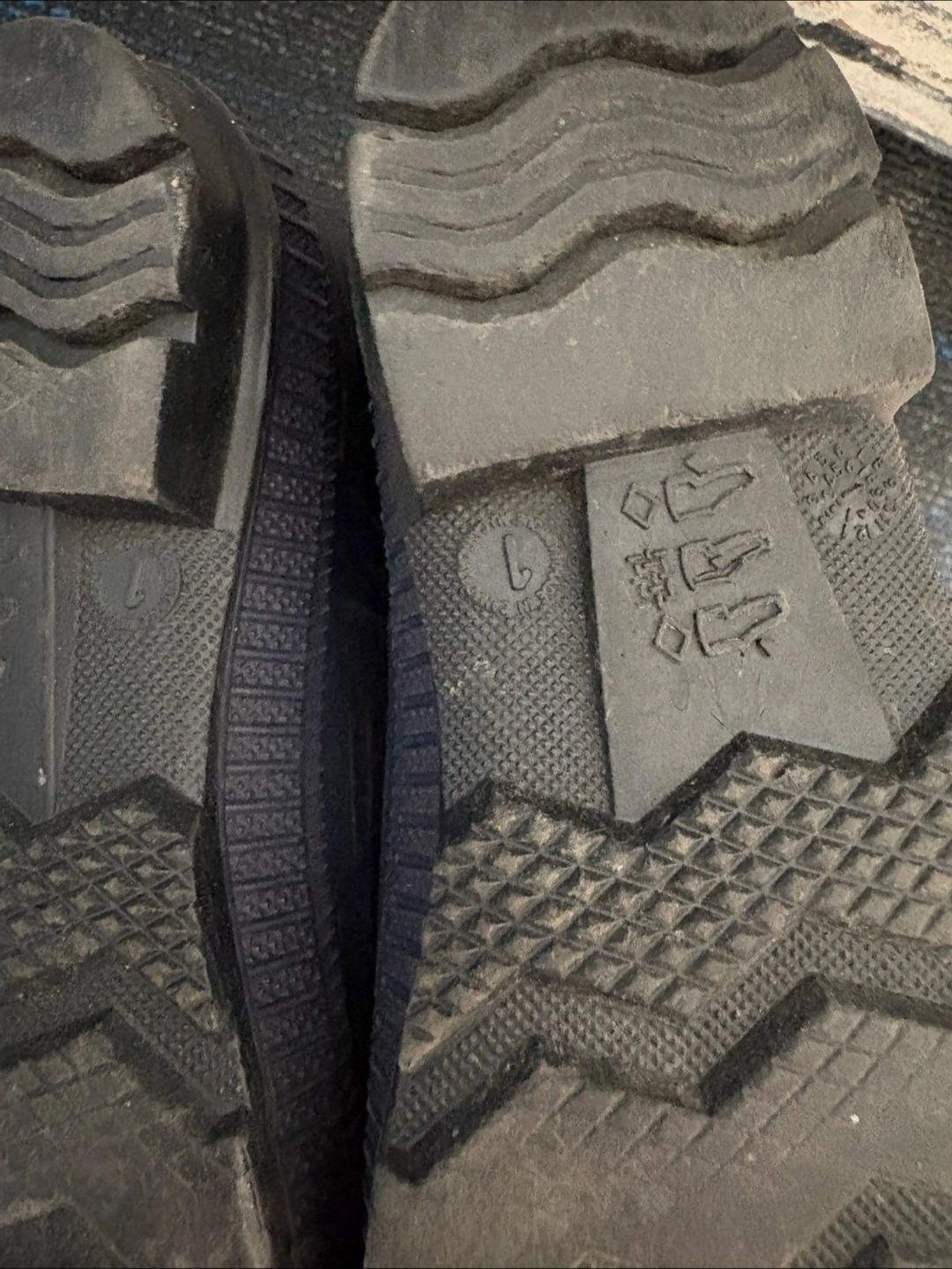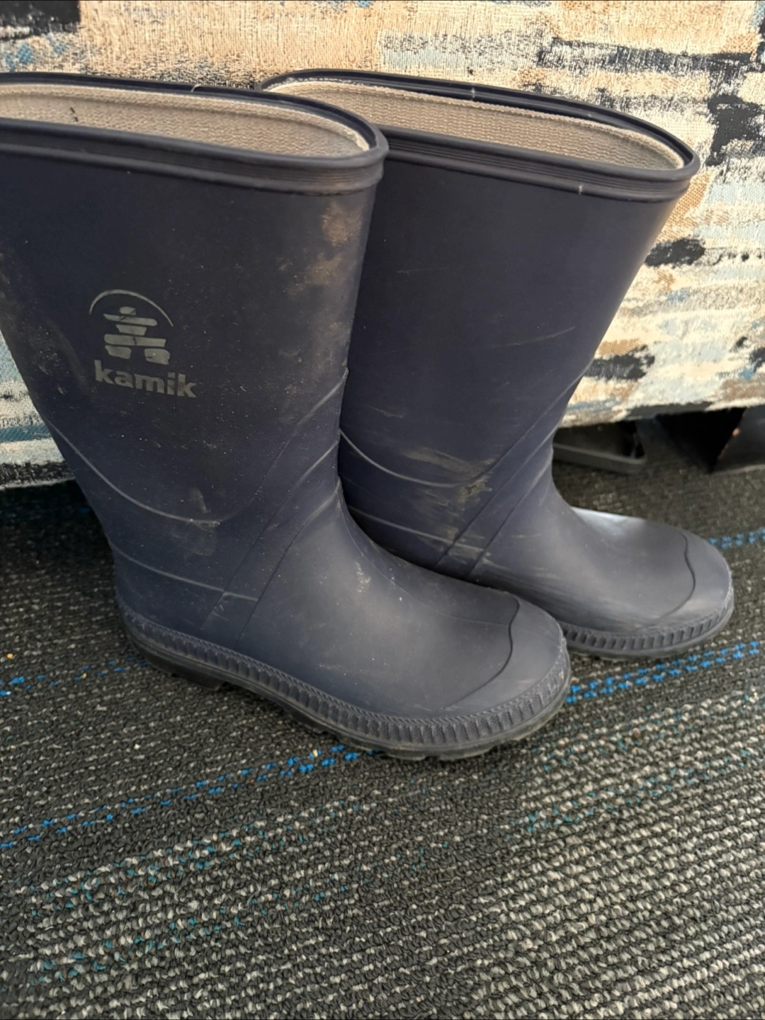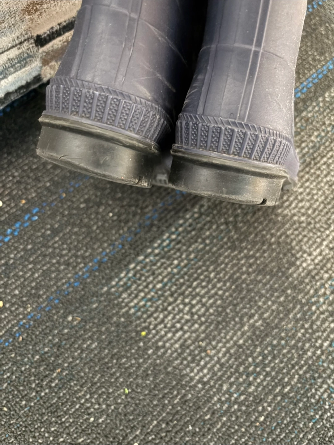 Navy blue rain boots. Perfect for splashing in puddles on a rainy day. The soles feature a textured pattern.