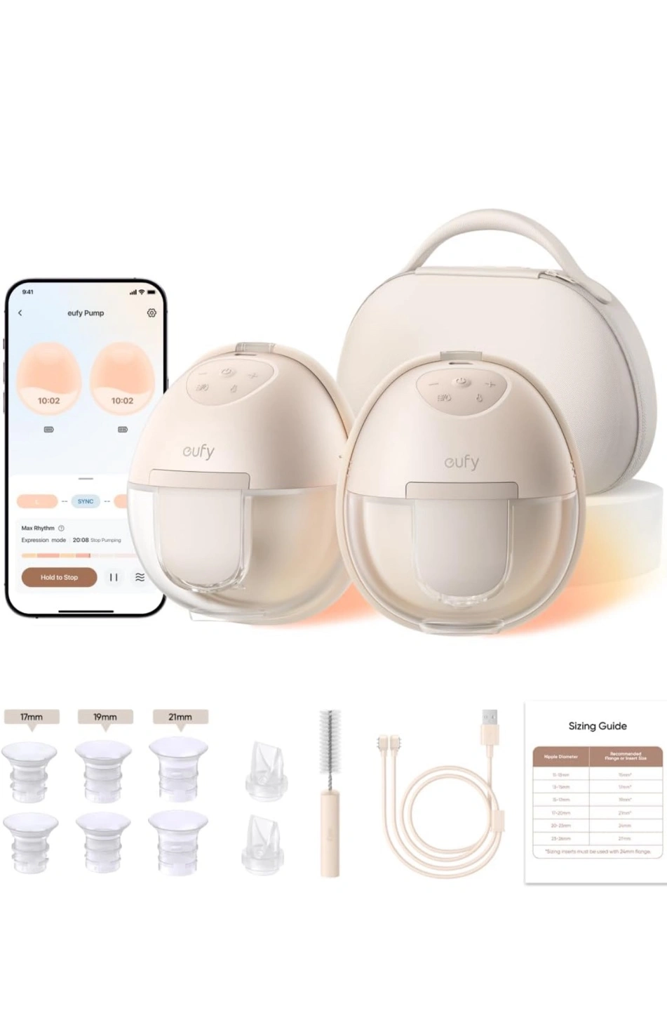 A complete breast pump set. Accessories included are inserts and a cleaning brush. Makes pumping an easier and more enjoyable experience.