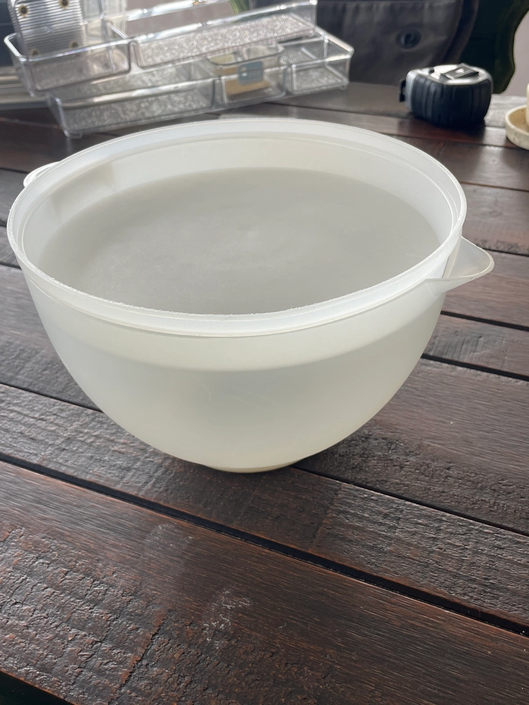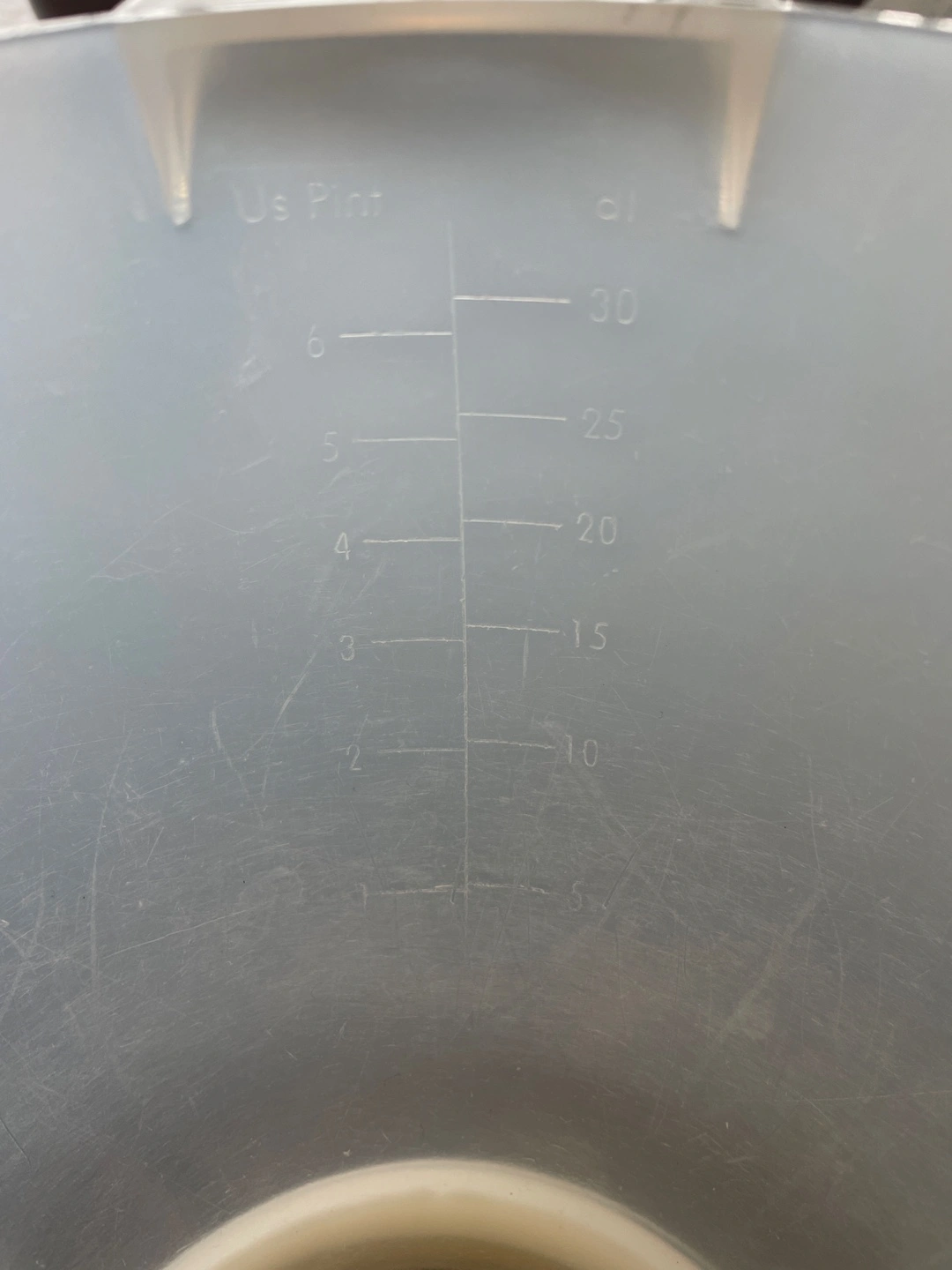 plastic mixing bowl with a lid. Has spout on one side and handle/hanger on the other. 6US pints/3litres/30 decilitres with marking on the inside. Pick up 29 queens quay east. If interested please send suggested day/times for pickup. Pickup scheduling is easiest/preferred for weekday days.