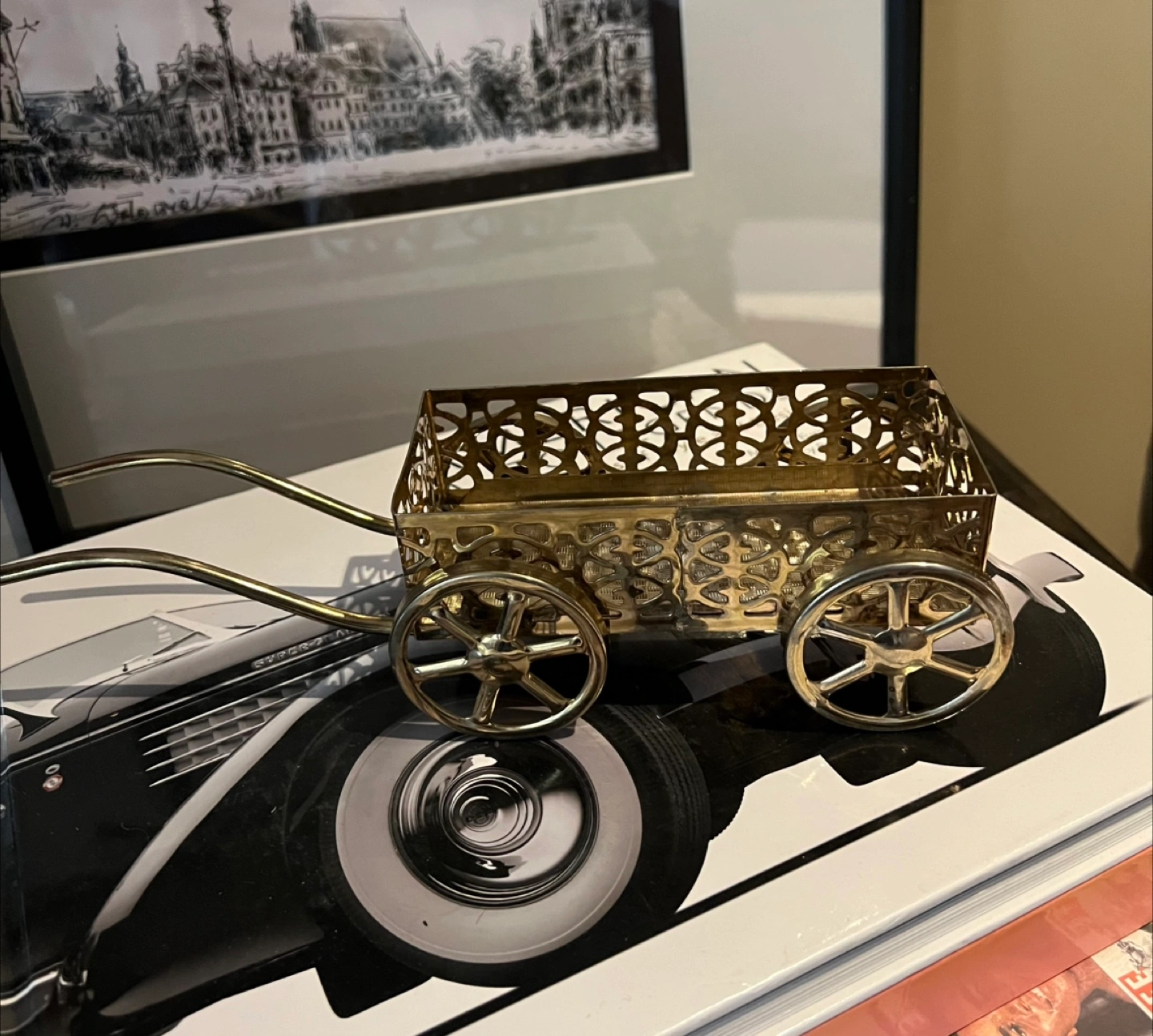 Brass miniature cart Perfect for holding small items or as a decorative piece! This unique piece features intricate detailing and a lovely golden hue Great condition Asking $5 Interested? Message me and please check my other listings…