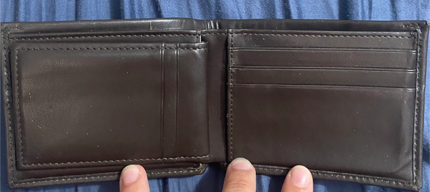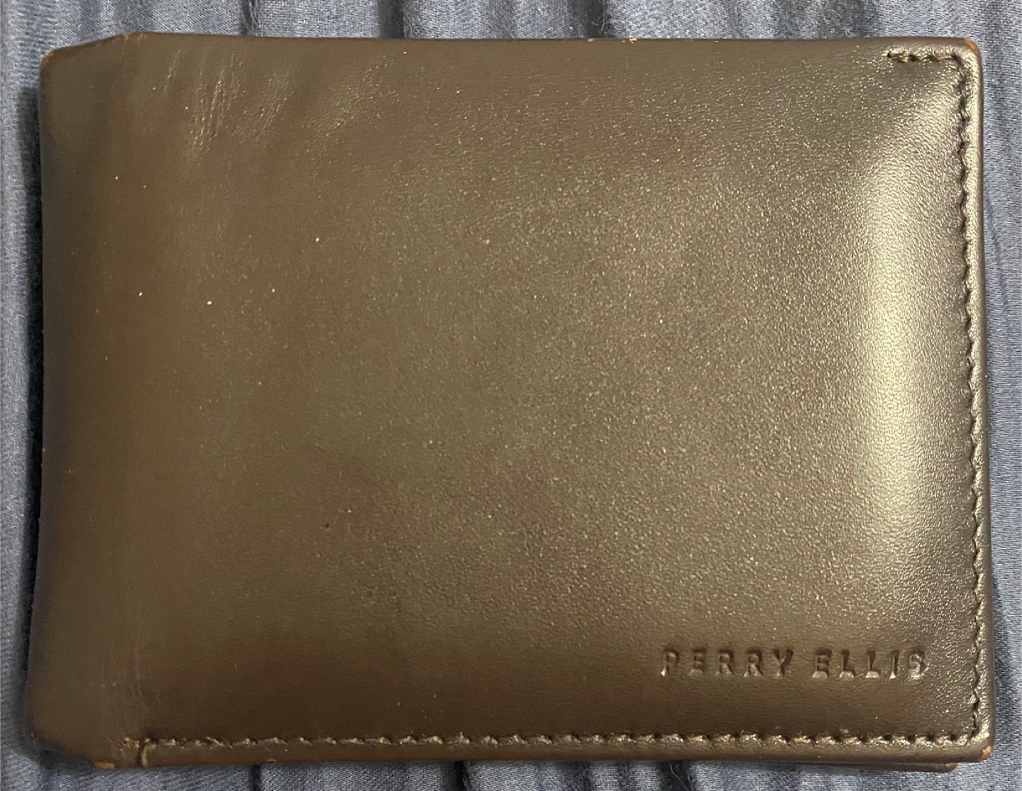 Here is a nice bi-fold wallet. Several card slots and a clear window pocket. The inside is a patterned fabric. This wallet is an excellent way to organize your essentials and keep them safe.