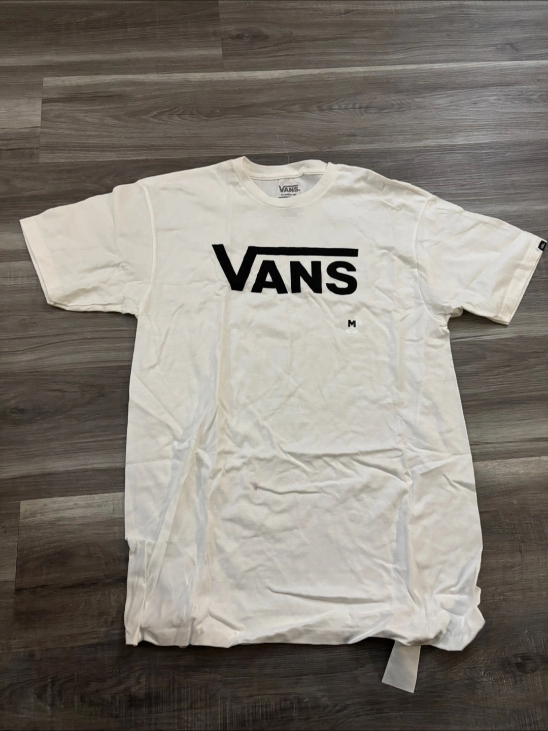A white T-shirt. Short sleeves. Large Vans logo on the front. It's a relaxing garment for all sorts of activities.
