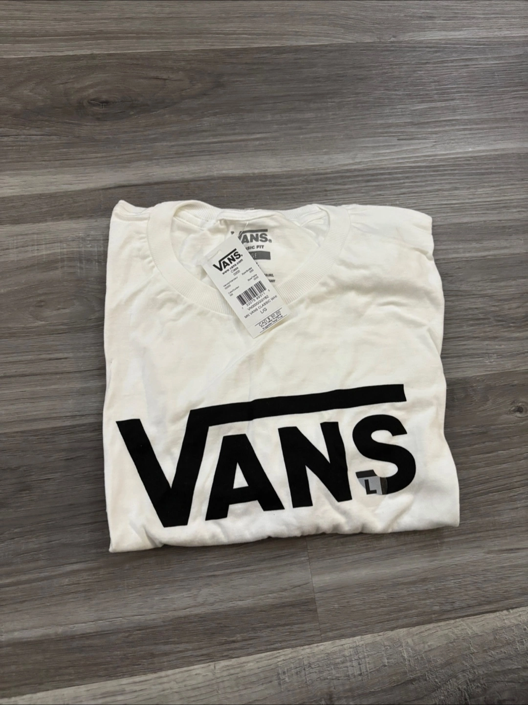 White t-shirt, folded neatly. Large black Vans logo. This t-shirt would be perfect for a relaxing day.