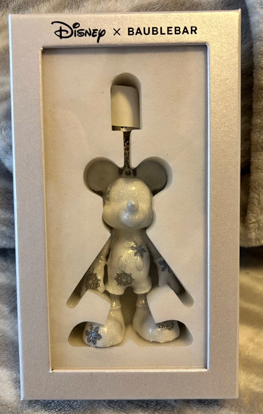 Mickey Mouse ornament in white. Detailing with silver accents. Comes in the original box. Can be used as an ornament or keychain, or bag charm 🤩