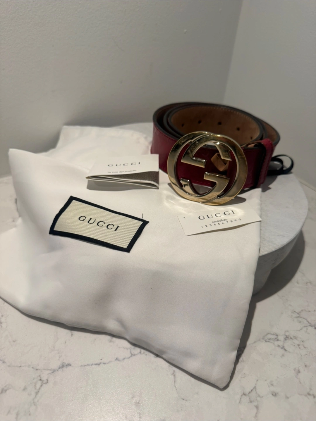 Authentic Red Gucci belt with double G emblem Measures 39 inches long Comes with dust bag Unisex