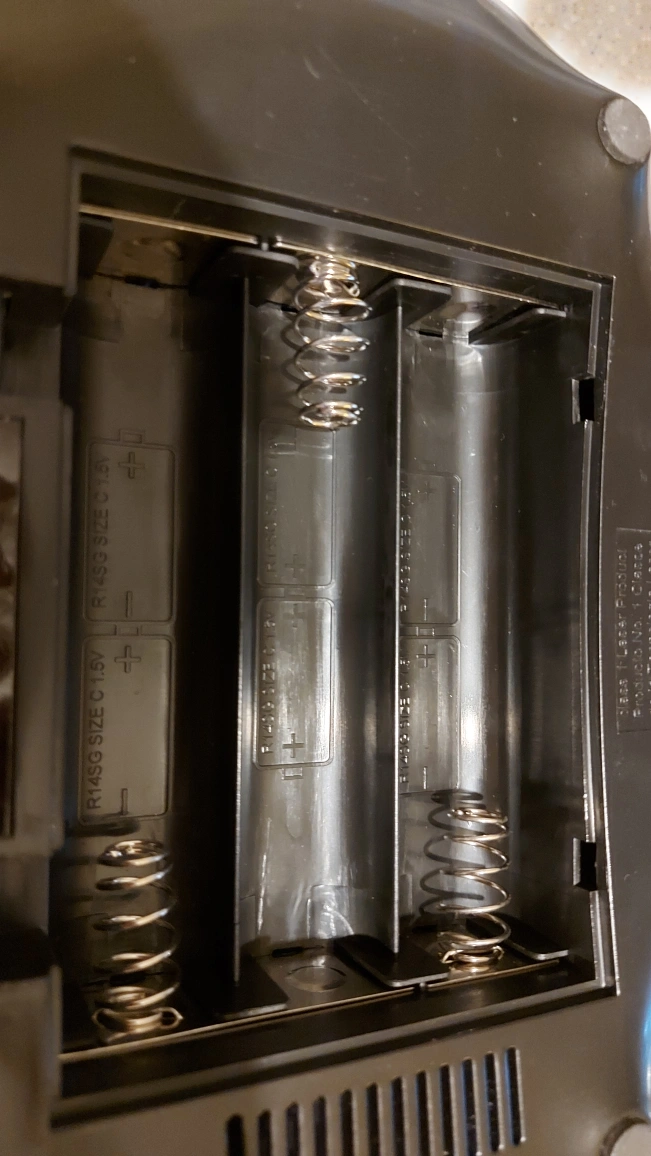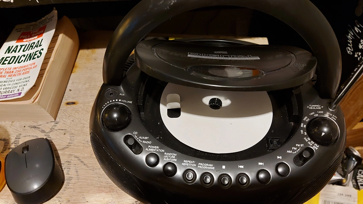 Black portable CD player with a handle. Features CD, AUX, and radio functionality. It's perfect for playing your favourite music in the comfort of your own space. Just needs a wipe down, which I'll happily do.