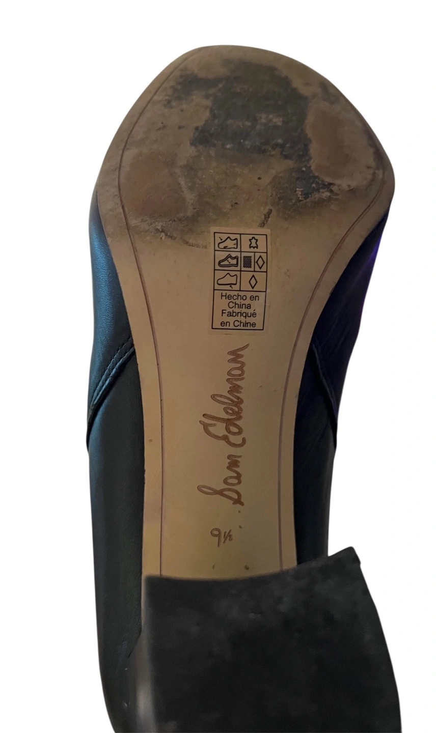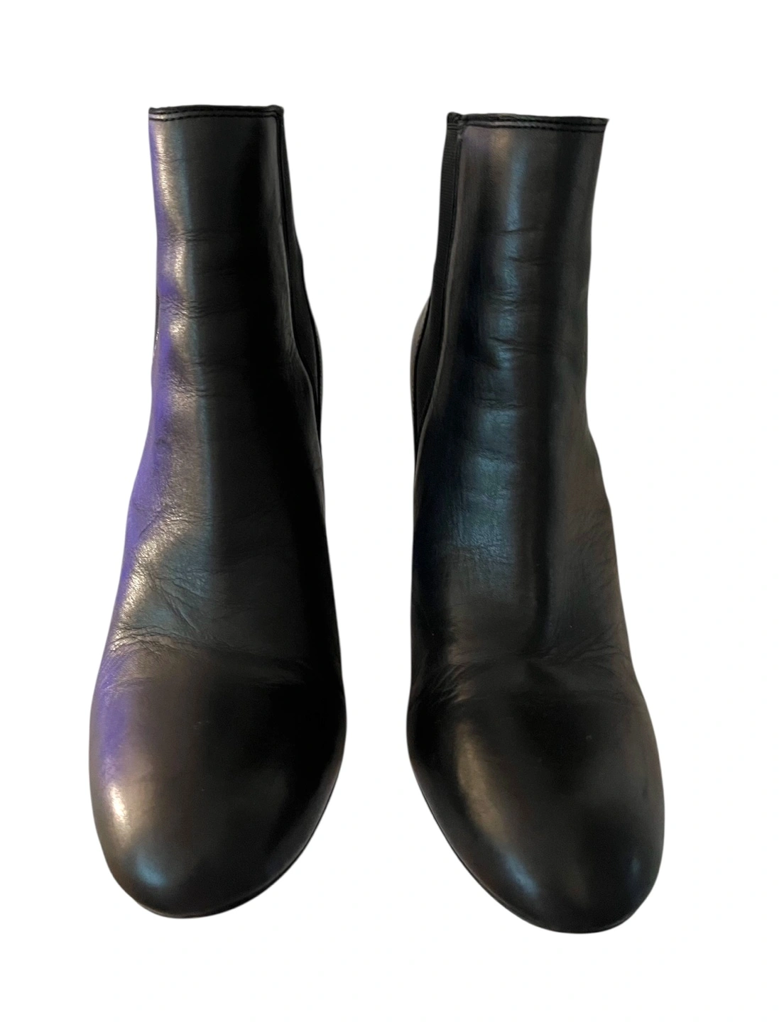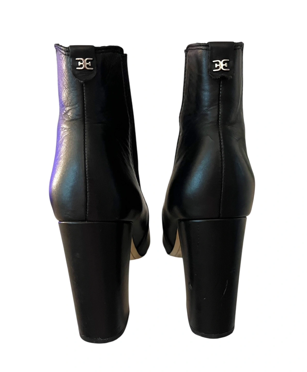 Command attention with these sleek black ankle boots. A modern take on a classic silhouette, these boots feature a smooth leather upper that exudes sophistication. The elastic side panels offer a comfortable and flexible fit, while the sturdy block heel provides both height and stability. A subtle zipper at the back adds a touch of detail. These boots are perfect for adding a touch of elegance to your everyday outfits, elevating your office attire, or completing a chic evening ensemble. Style: Chelsea Color: Black Department: Women Upper Material: Leather Character: Classic, Elegant, Sophisticated, Modern, Office Shoe Shaft Style: Ankle Heel Style: Block Lining Material: Leather Insole Material: Leather Heel Height: High (3-3.9 in) Type: Boot Model: Chelsea Block Heel Excellent Condition PU Ottawa & Strasburg, Kitchener Keywords: Sam Edelman, black ankle boots, leather boots, block heel boots, chelsea boots, women's boots, size 9.5, dress boots, casual boots, fashion boots, heeled boots, ankle booties, black leather booties