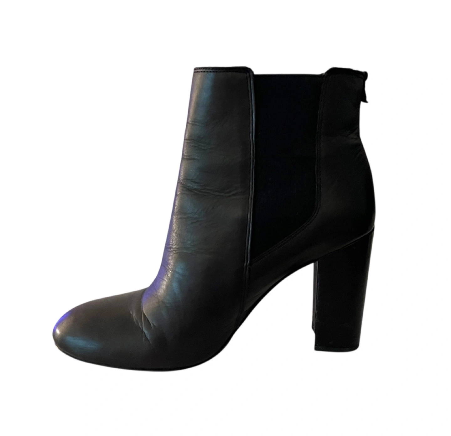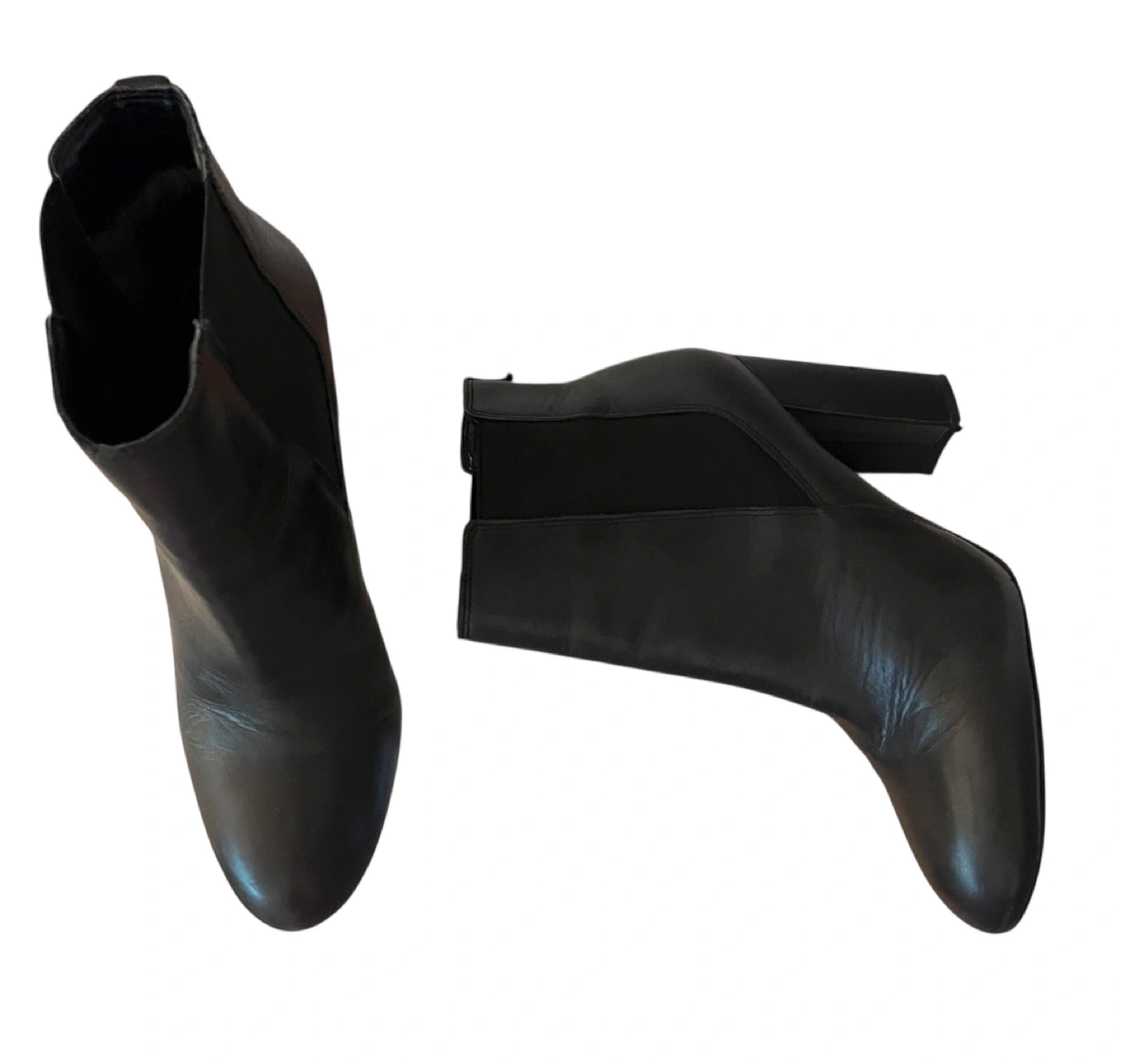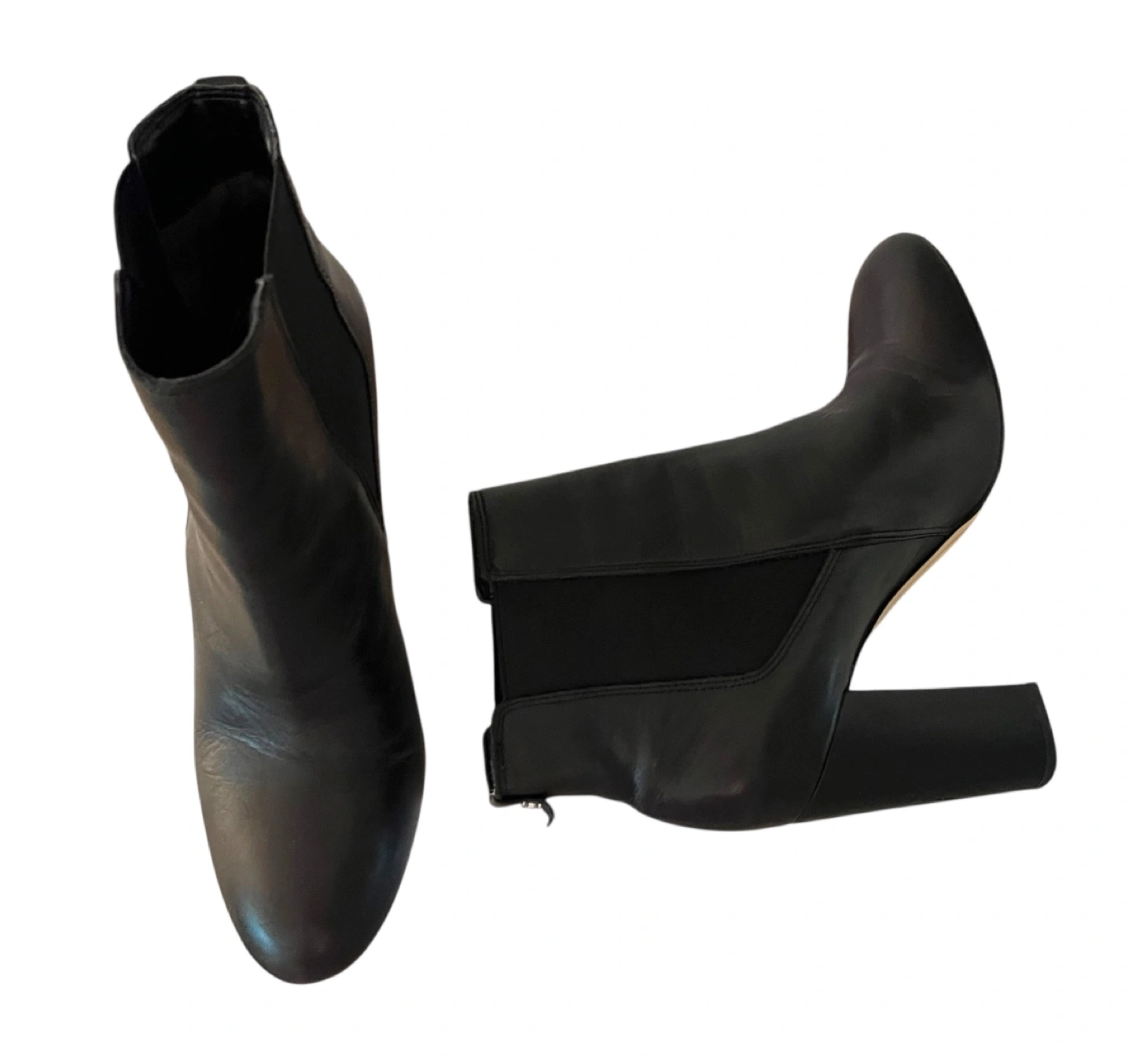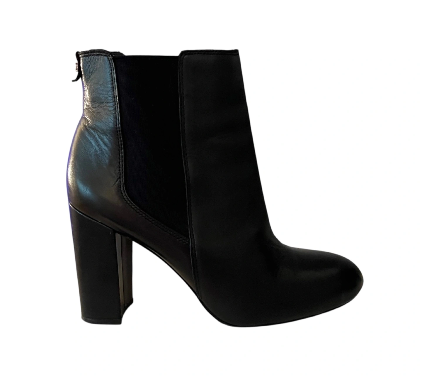 Command attention with these sleek black ankle boots. A modern take on a classic silhouette, these boots feature a smooth leather upper that exudes sophistication. The elastic side panels offer a comfortable and flexible fit, while the sturdy block heel provides both height and stability. A subtle zipper at the back adds a touch of detail. These boots are perfect for adding a touch of elegance to your everyday outfits, elevating your office attire, or completing a chic evening ensemble. Style: Chelsea Color: Black Department: Women Upper Material: Leather Character: Classic, Elegant, Sophisticated, Modern, Office Shoe Shaft Style: Ankle Heel Style: Block Lining Material: Leather Insole Material: Leather Heel Height: High (3-3.9 in) Type: Boot Model: Chelsea Block Heel Excellent Condition PU Ottawa & Strasburg, Kitchener Keywords: Sam Edelman, black ankle boots, leather boots, block heel boots, chelsea boots, women's boots, size 9.5, dress boots, casual boots, fashion boots, heeled boots, ankle booties, black leather booties