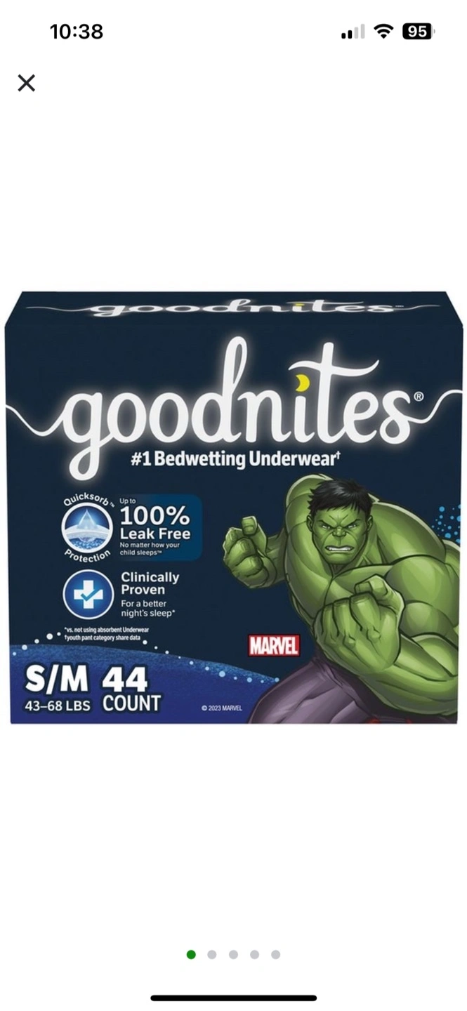 Bedwetting underwear. Features a Marvel graphic on the front. Comes in a package of 44. Finding a comfortable night's sleep is achievable with these. New sealed box