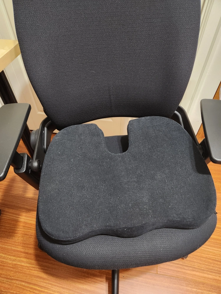 A black, ergonomic seat cushion. Features a contoured design. Great for long periods of sitting.