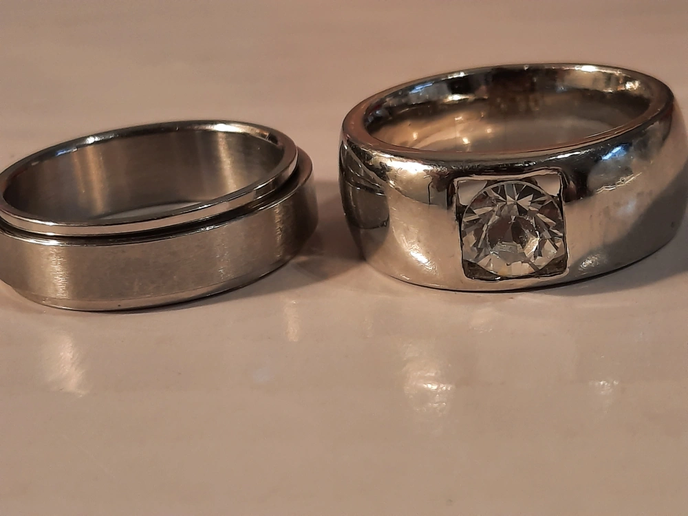 A pair of rings; one with a large stone and another that appears to be a spinner ring. The rings are silver in colour. Put them on to unwind and enjoy the day.