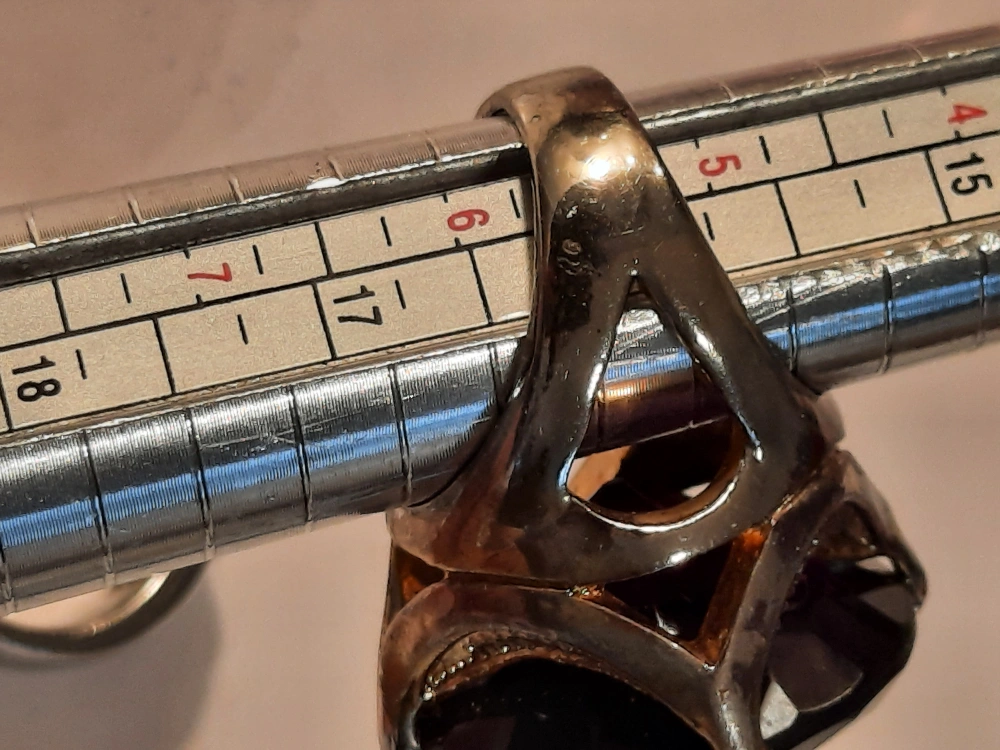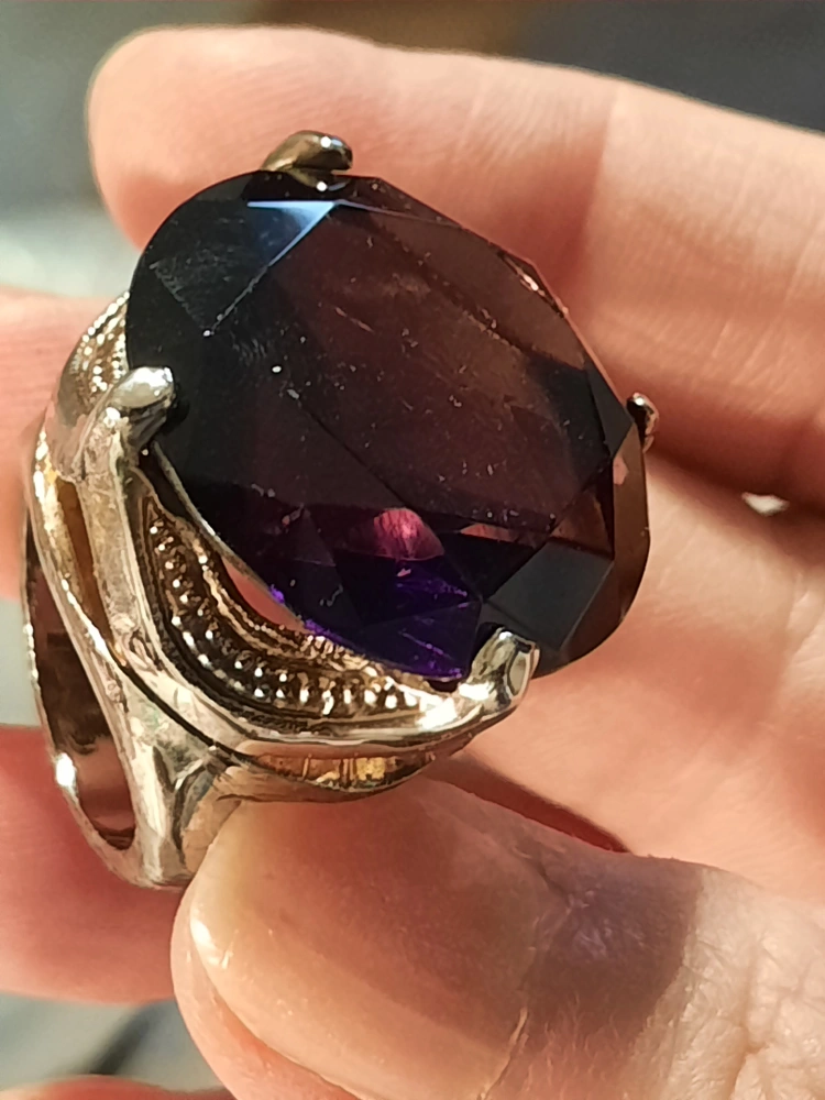 A beautiful ring, featuring a large purple stone. The band is a light silver colour with gold accents. Perfect for adding a touch of elegance to any outfit, bringing a touch of zen.