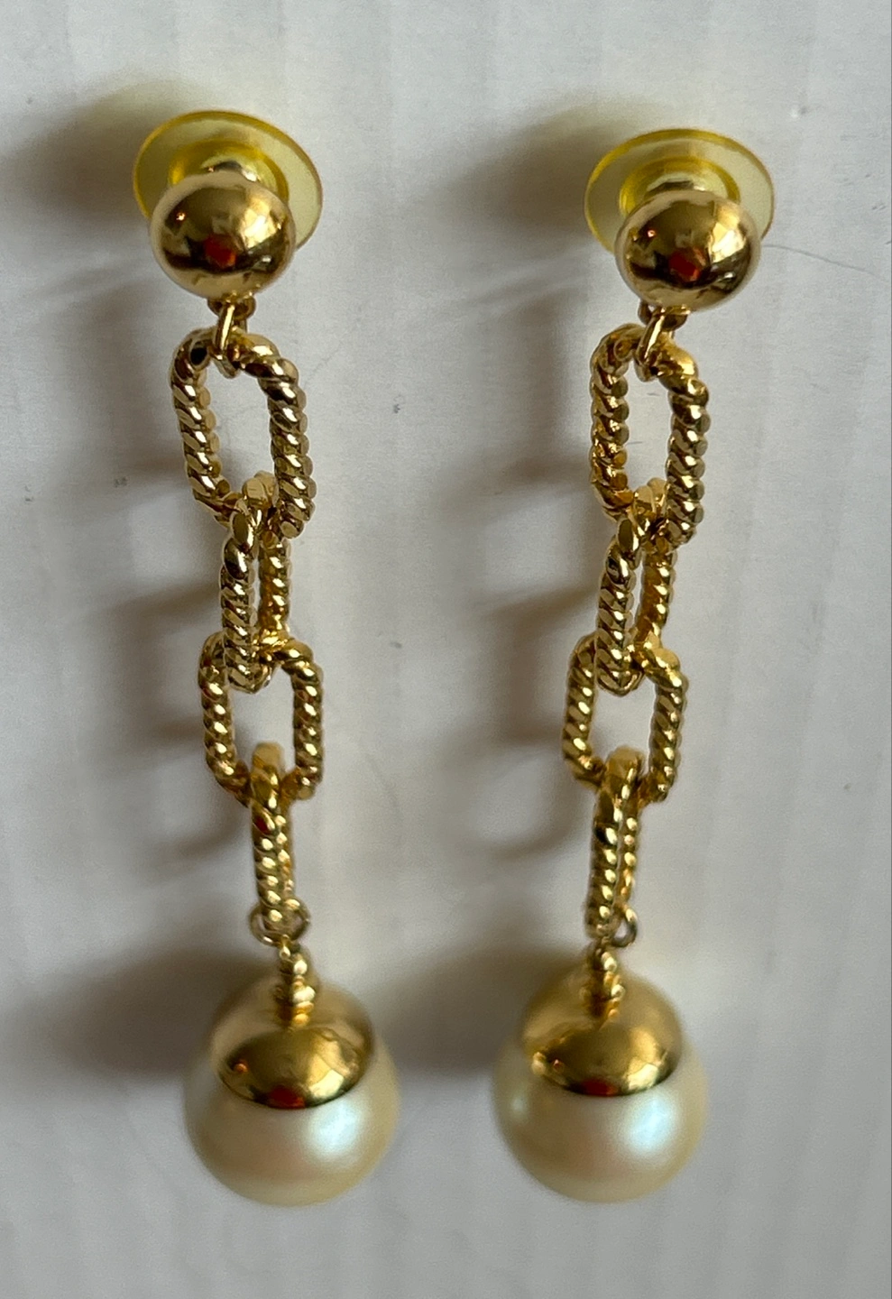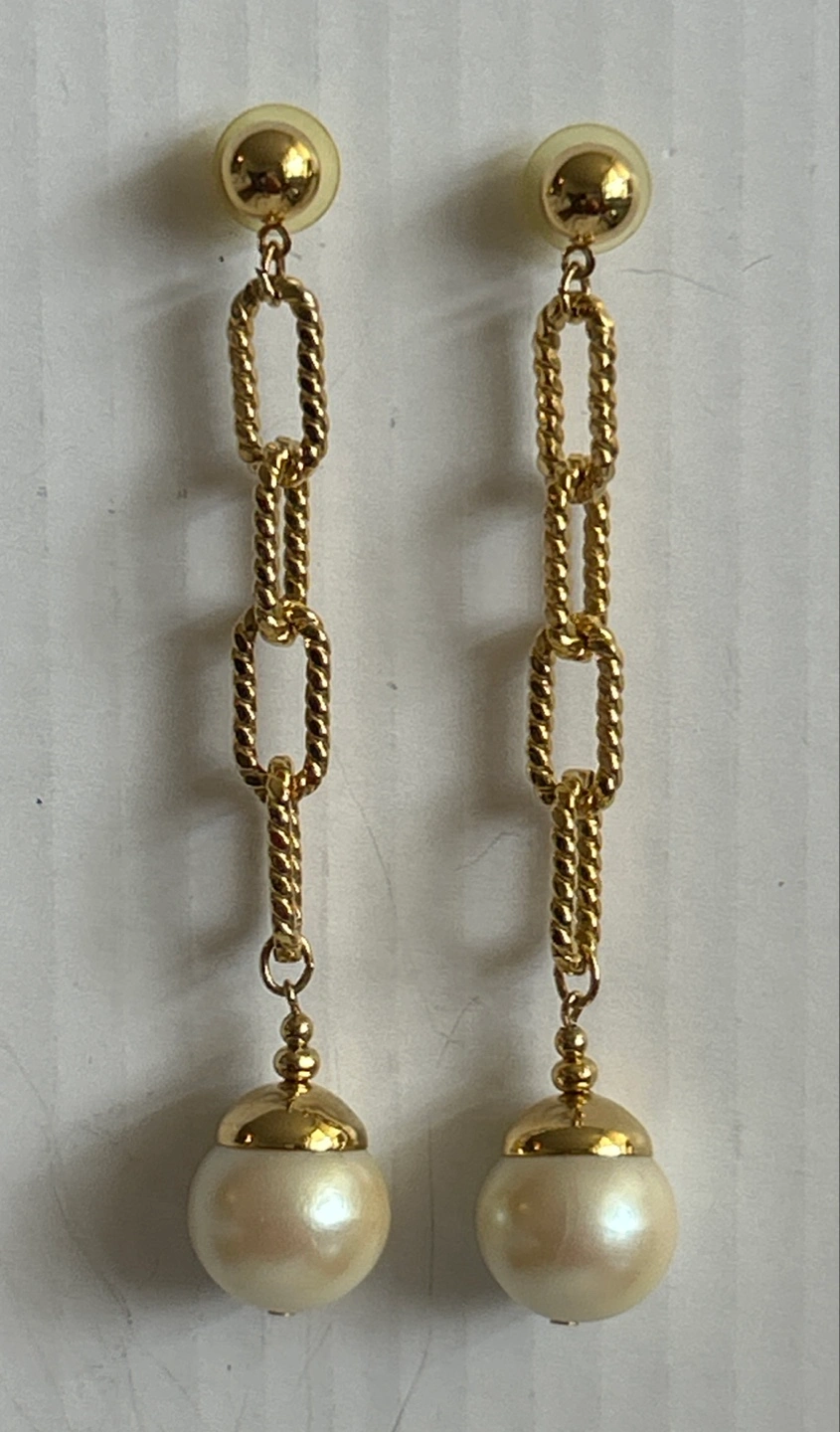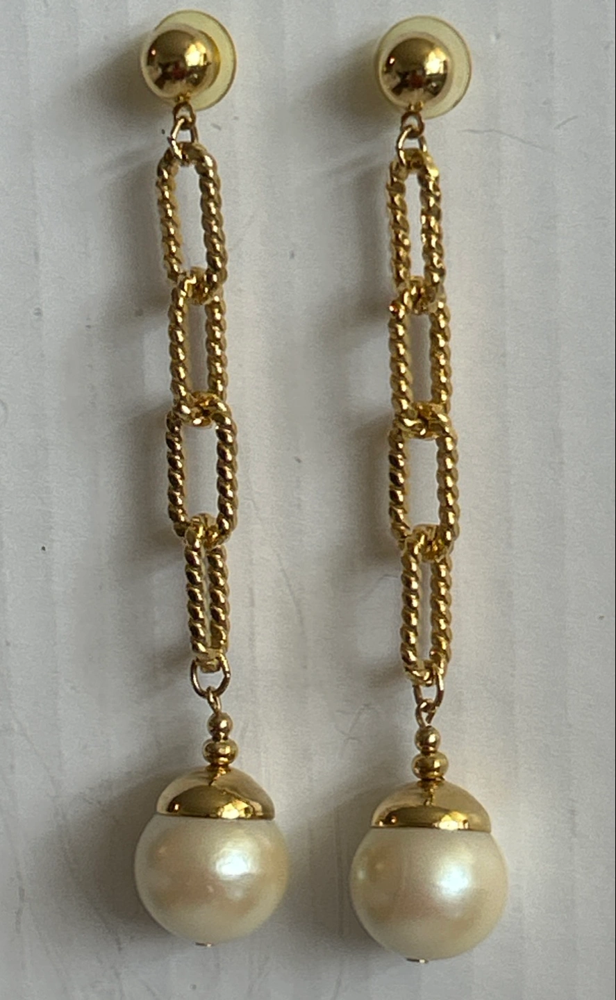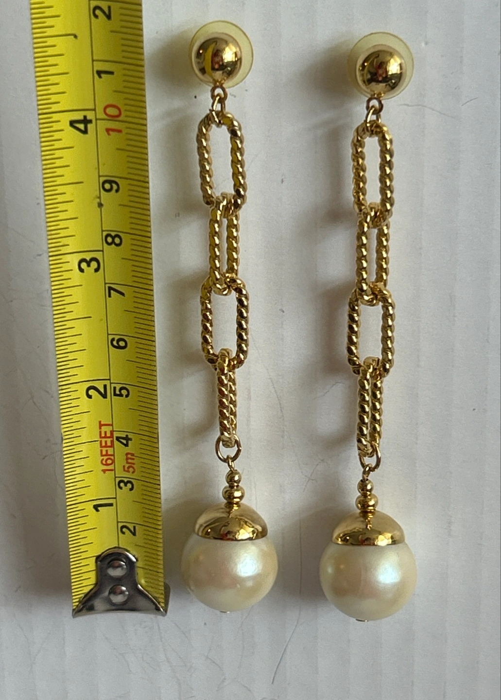 A pair of vintage gorgeous long drop earrings. Featuring gold chains and pearl-like beads. The chain is an elongated oval shape with a twist. These earrings would look great for any occasion. It looks so classy. The quality is superb. Smoke/Pet free home. Cash and pick up only