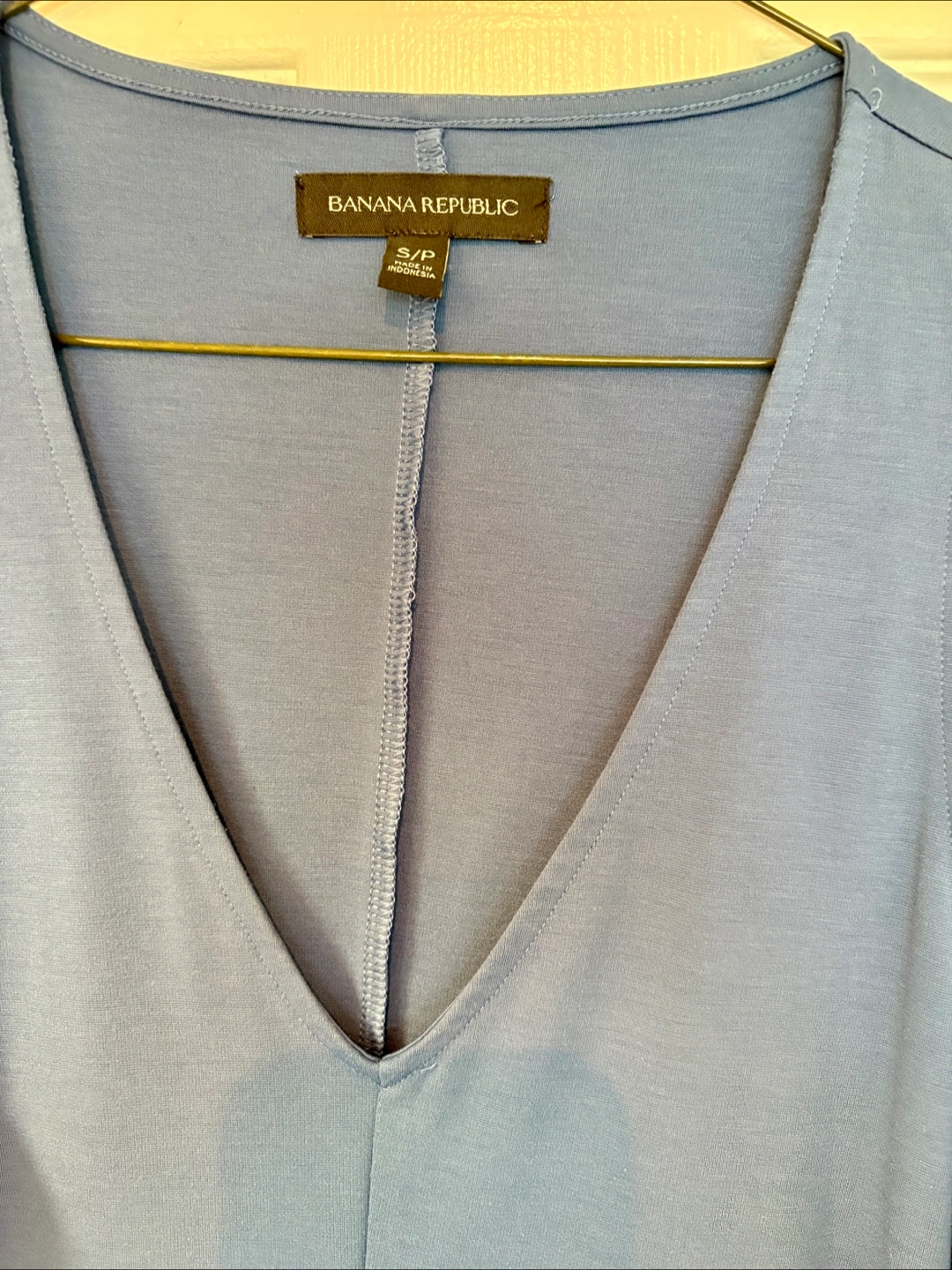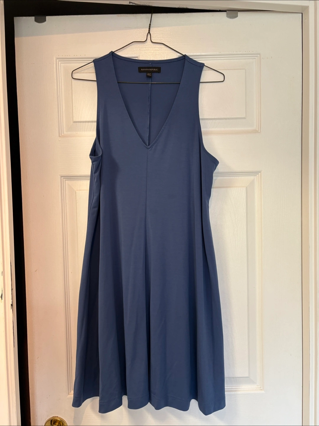 A beautiful sleeveless dress in a muted blue. The dress has a V-neckline and is made of soft material. A simple dress that is perfect for a summer day. size small but it’s loose so can fit medium