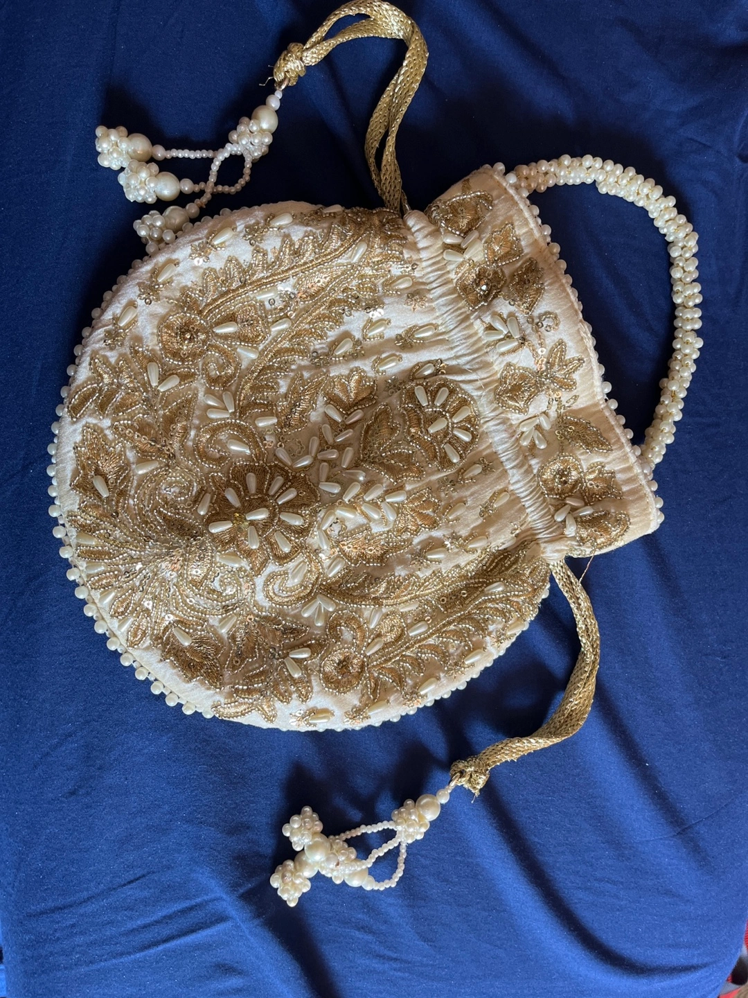 A beautiful, ivory-toned evening bag. Features intricate beading and pearl details. A top handle, made with pearls. The interior is a gold-toned fabric. Use this stunning piece to complement your elegant outfits.