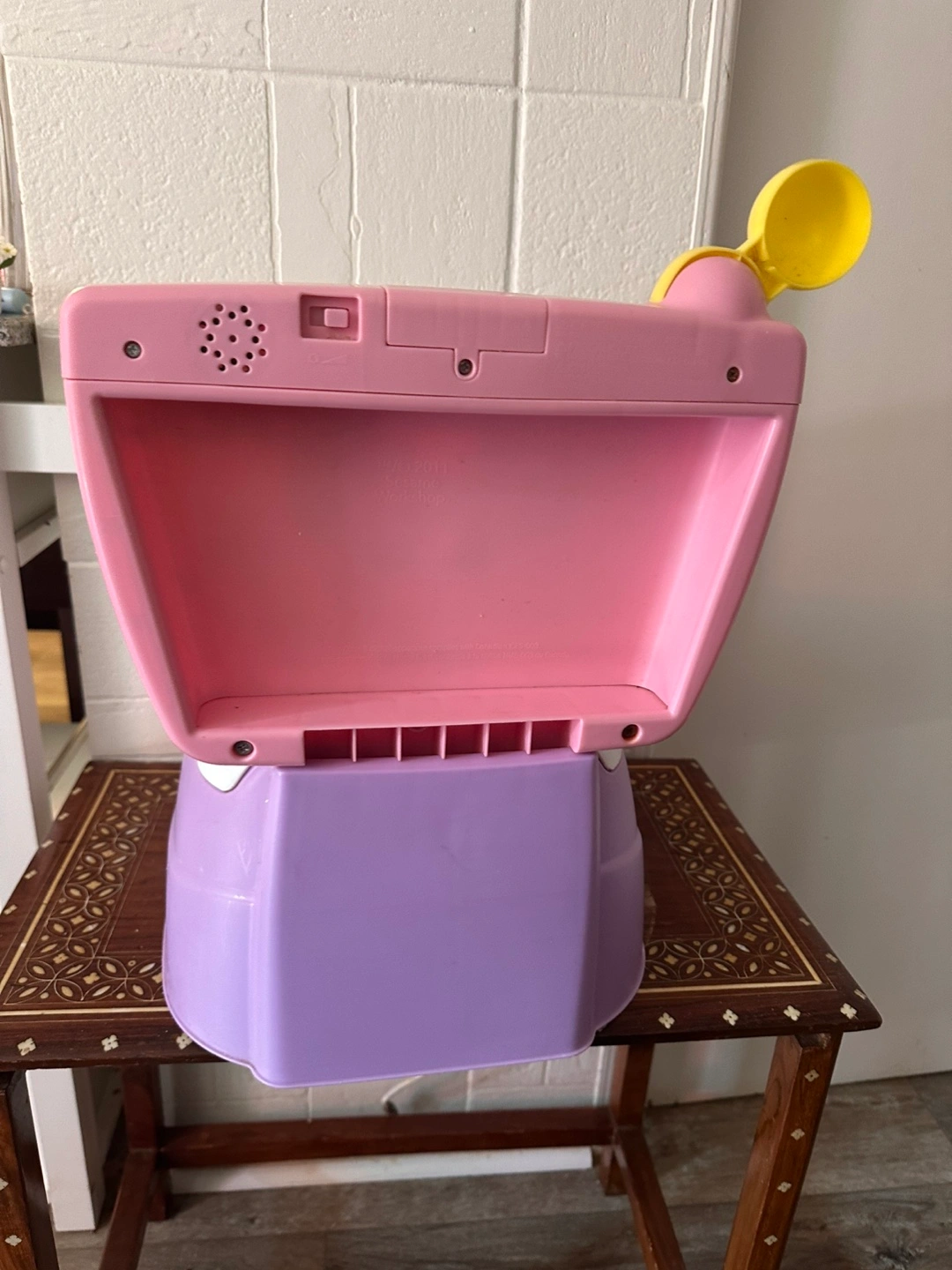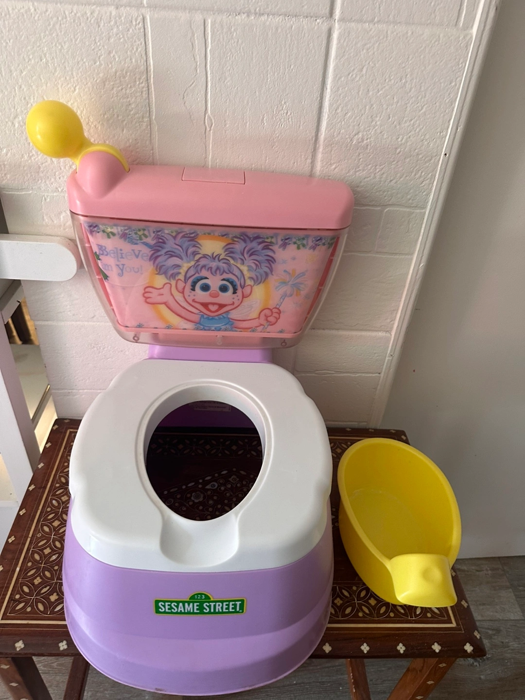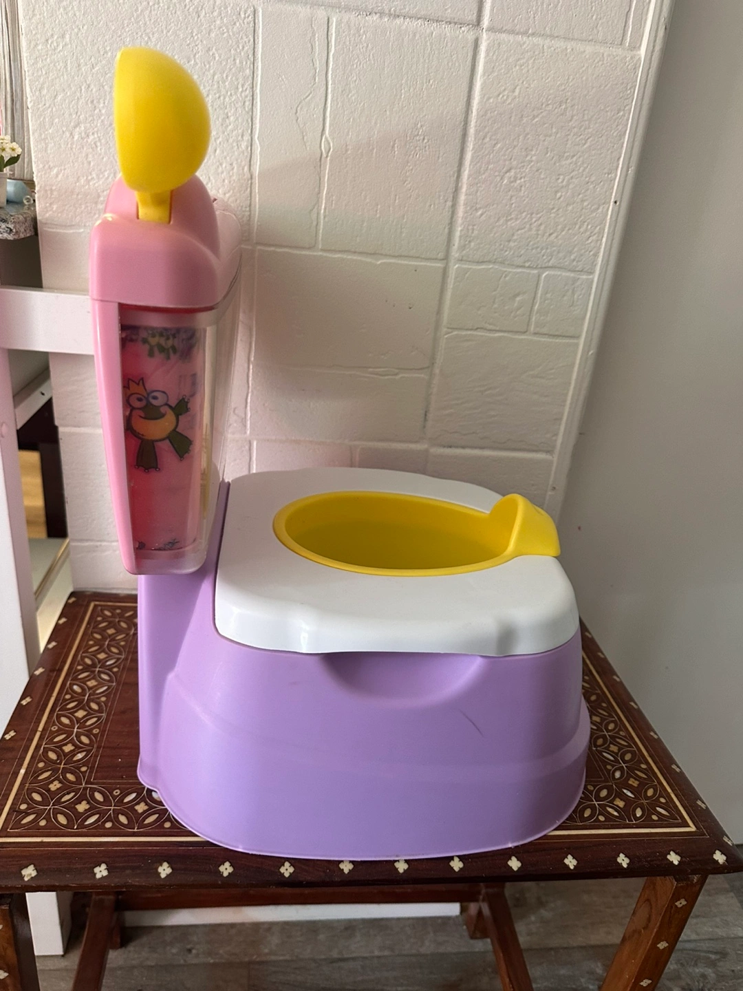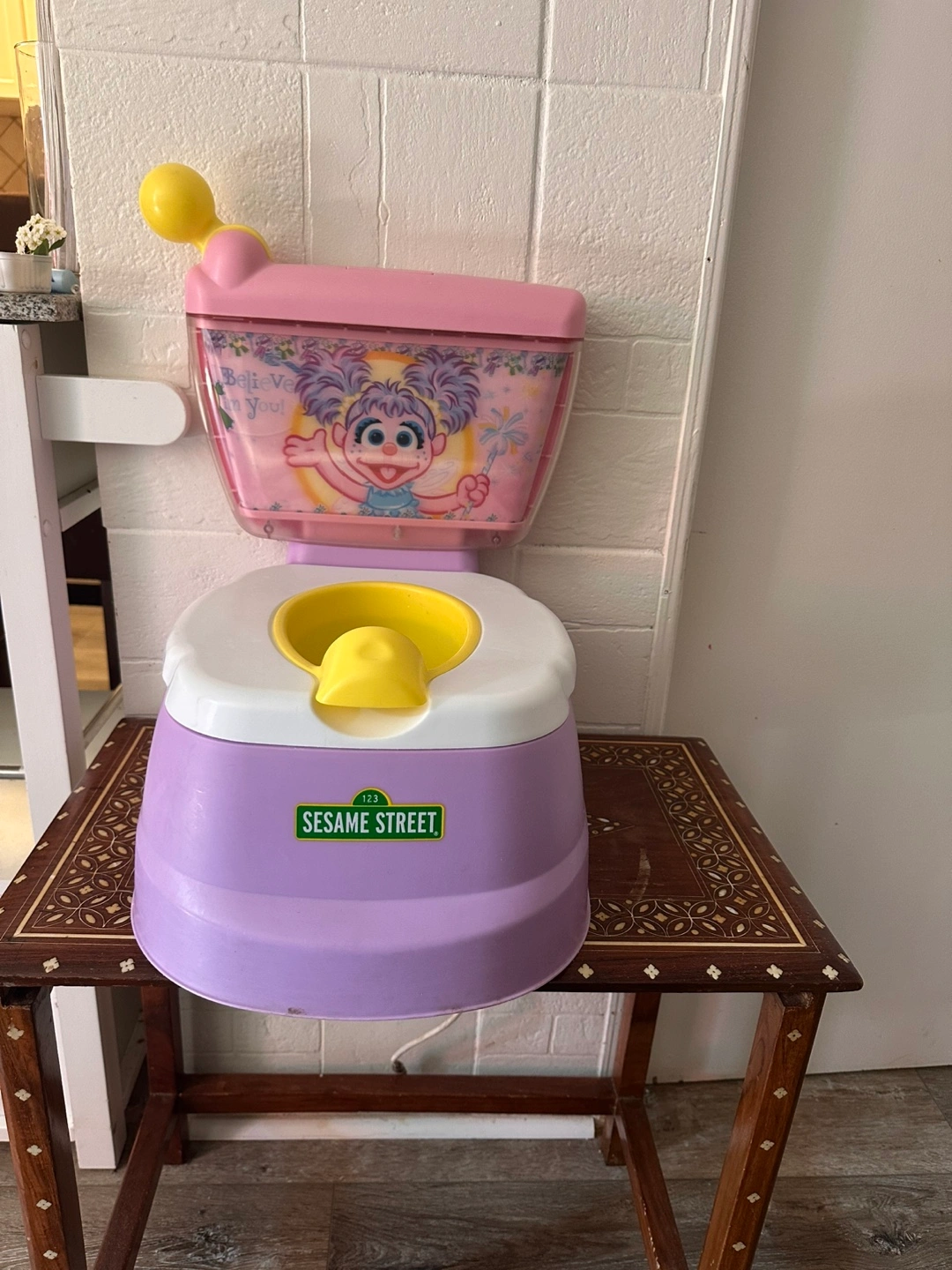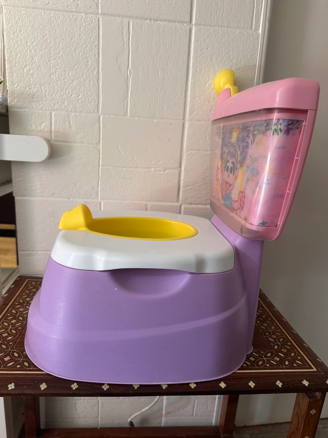 Made of purple and pink plastic. Features a Sesame Street theme. It's a potty training toilet perfect for toddlers.