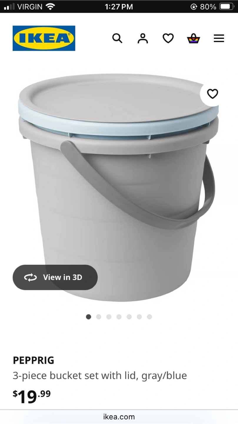 Bucket set with lid. Comes with two buckets, one grey and one blue. The set also comes with a grey lid. Never been used. Product info: https://www.ikea.com/ca/en/p/pepprig-3-piece-bucket-set-with-lid-gray-blue-50567613/