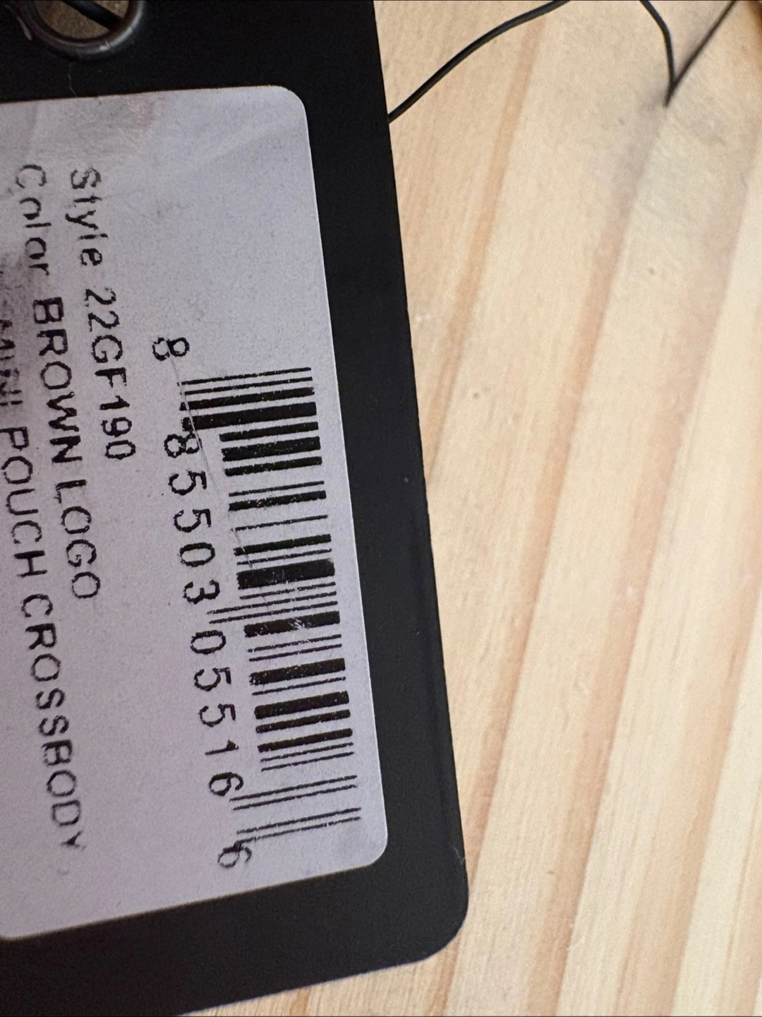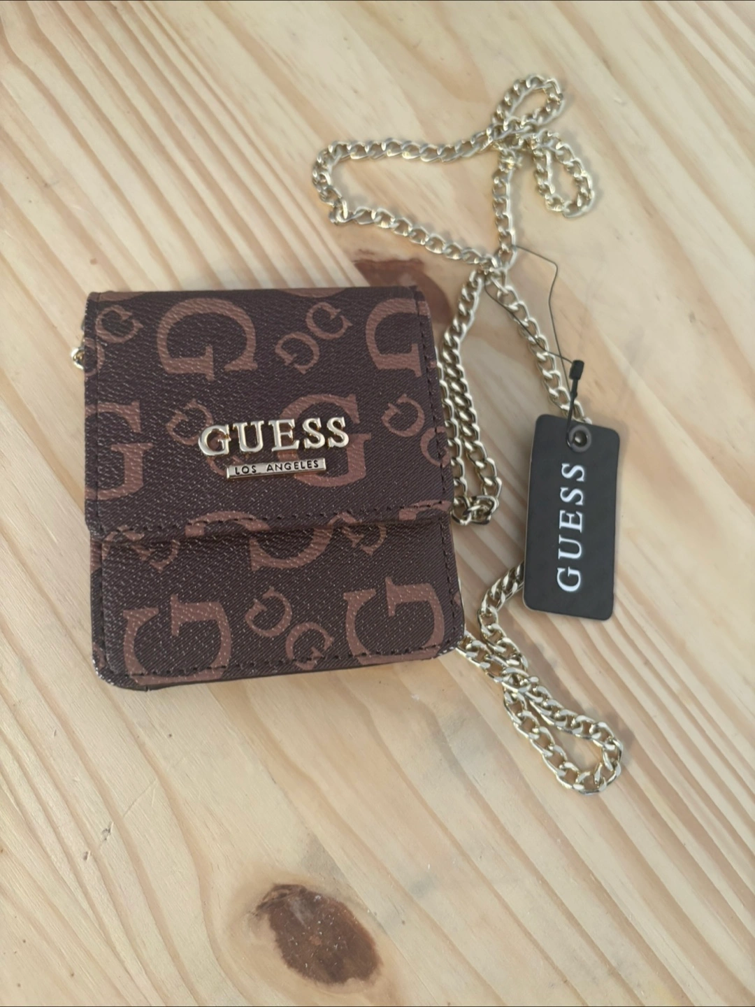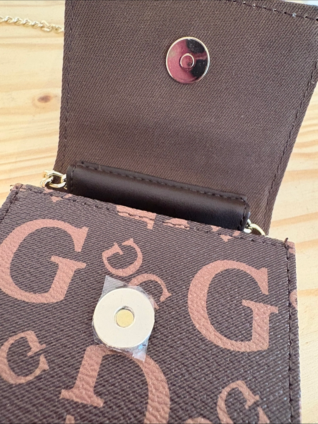 A small purse with a chain strap. The purse has a flap and an opening to store things. The exterior features a repeating logo pattern, great for pairing with many outfits.