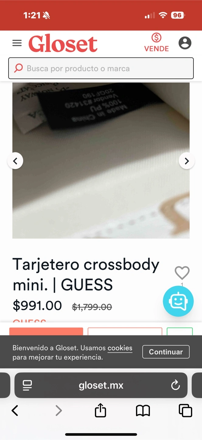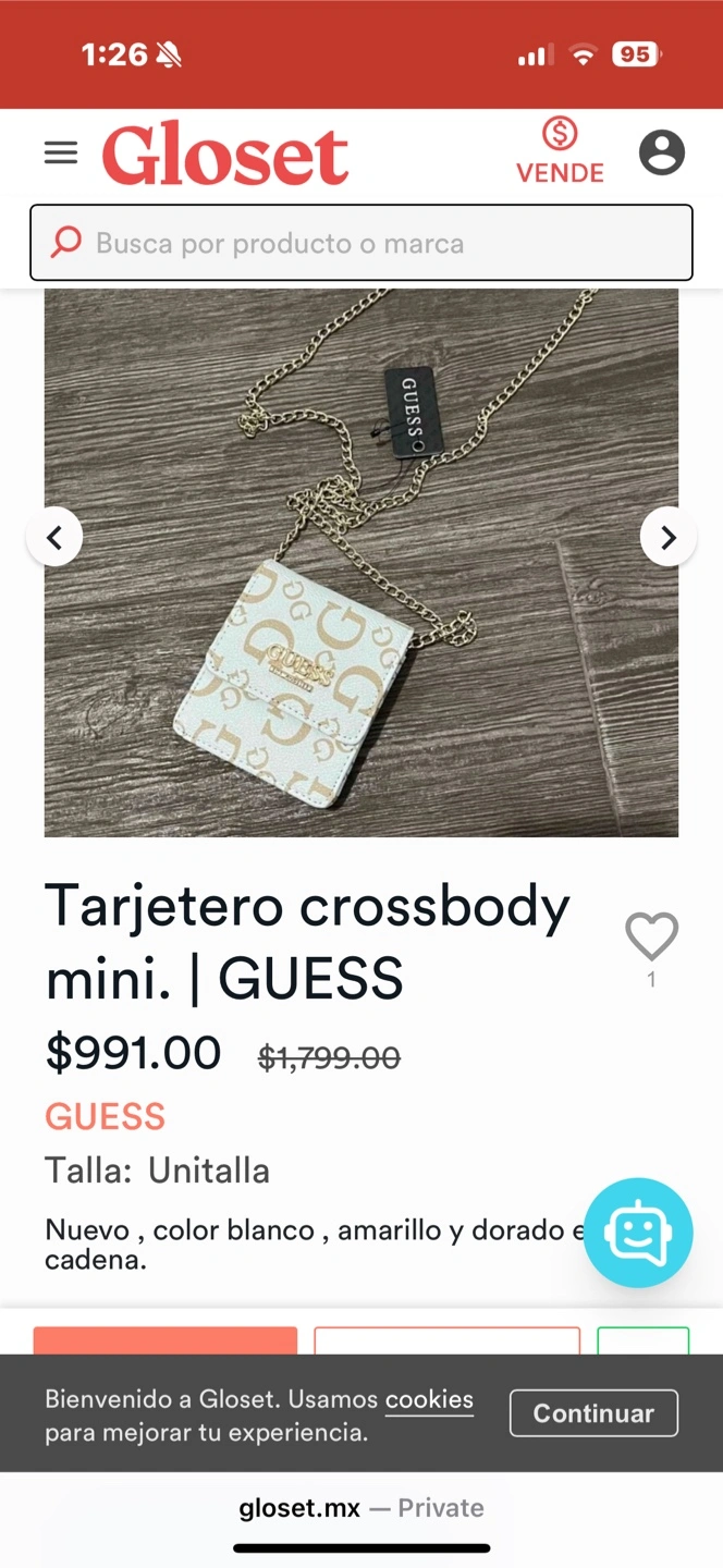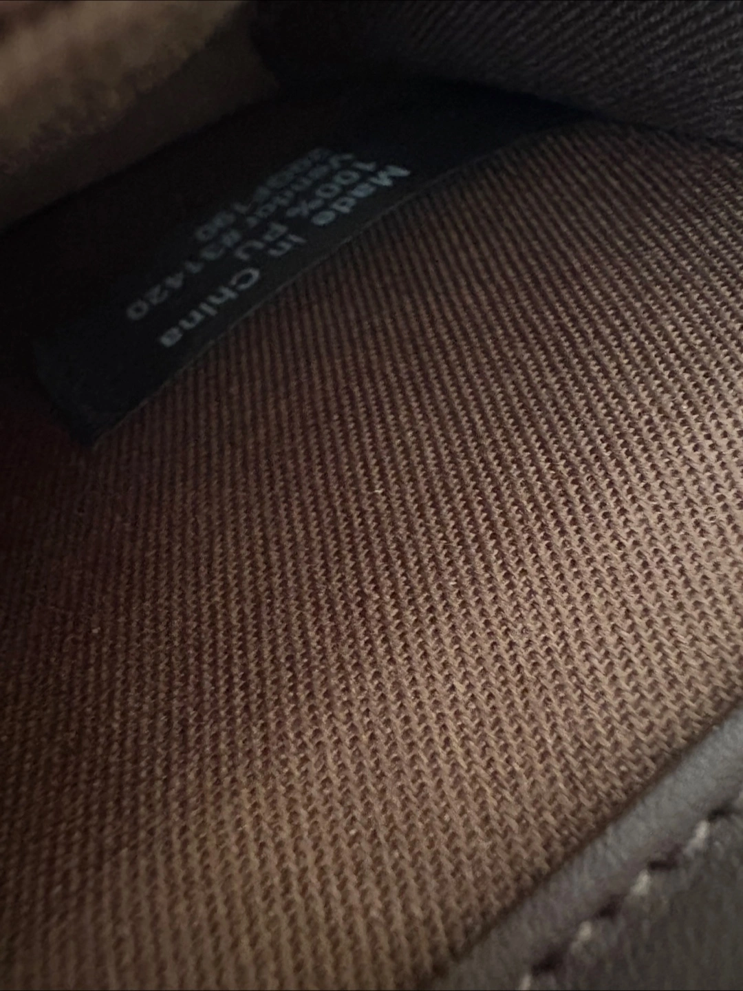 A small purse with a chain strap. The purse has a flap and an opening to store things. The exterior features a repeating logo pattern, great for pairing with many outfits.