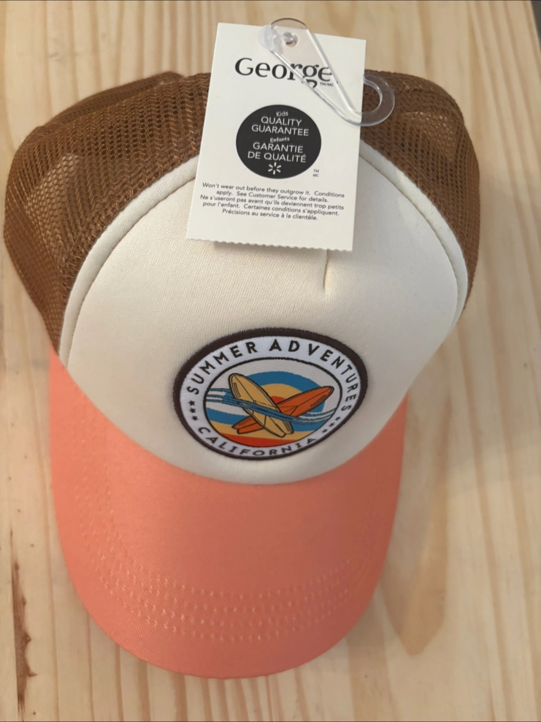 Featuring a colourful patch. The mesh is brown and the bill is peach. Perfect for a sunny day at the beach.