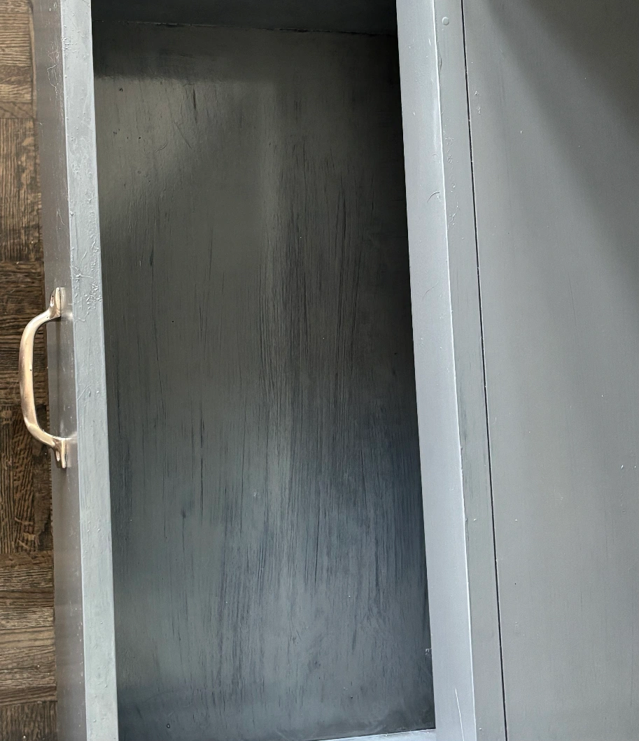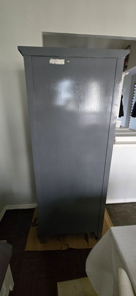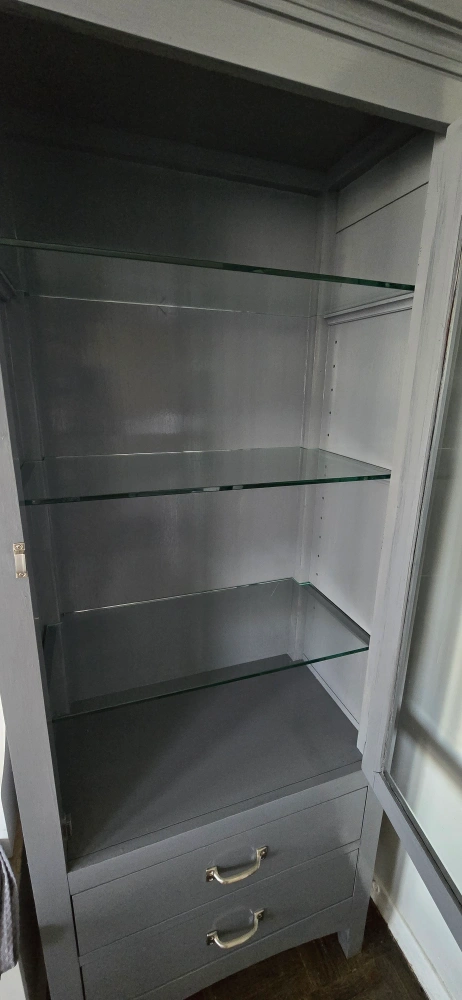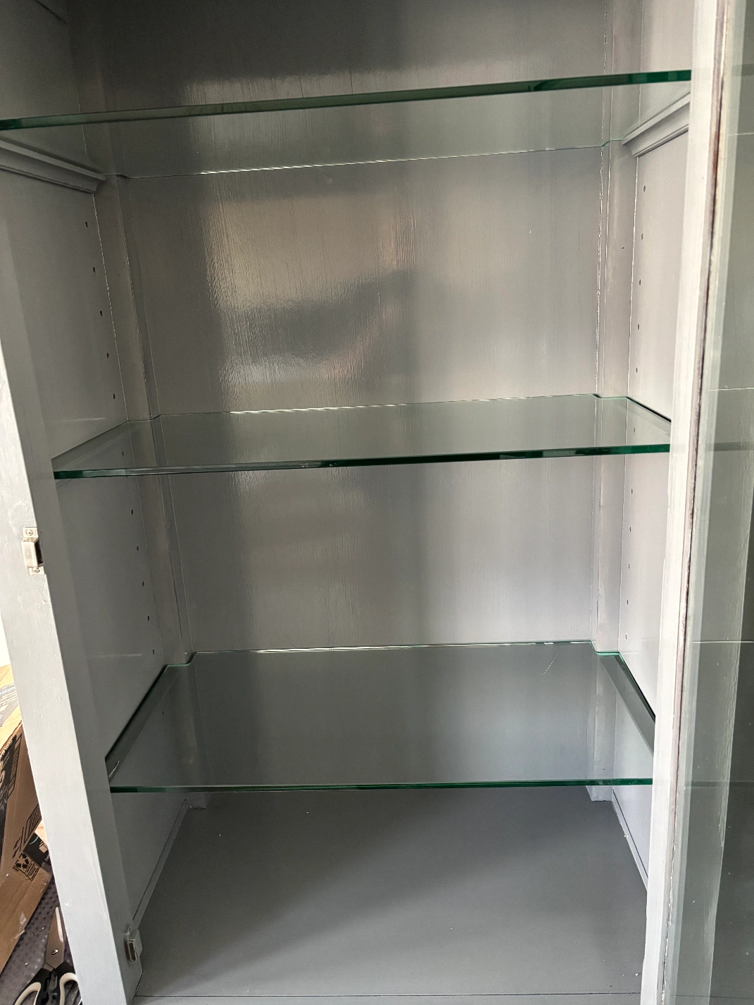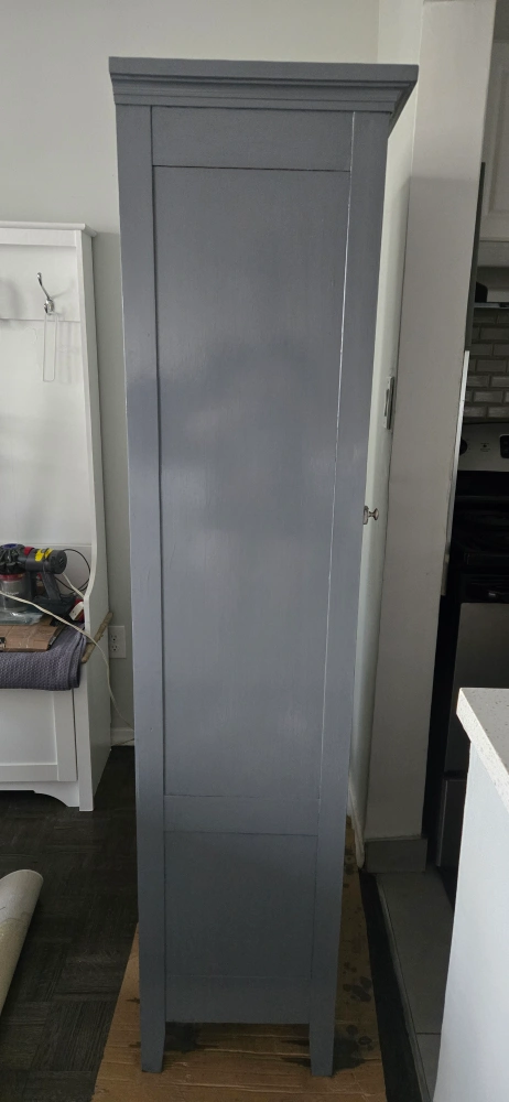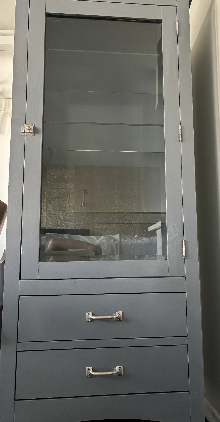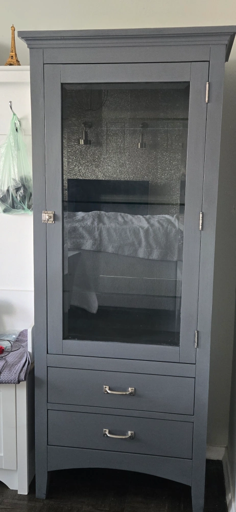 This home-painted cabinet, finished in Minwax Wood Finish Penetrating Satin, Classic Grey 271, features three tempered glass shelves and is constructed of heavy wood by Great Union Limited. It is in excellent condition, with no broken hardware or parts. Offered for sale due to a family downsizing, it is priced at $175 or best offer, and pickup only is available in the Marlee and Ridelle Avenue area.