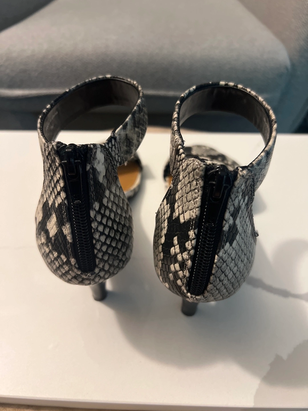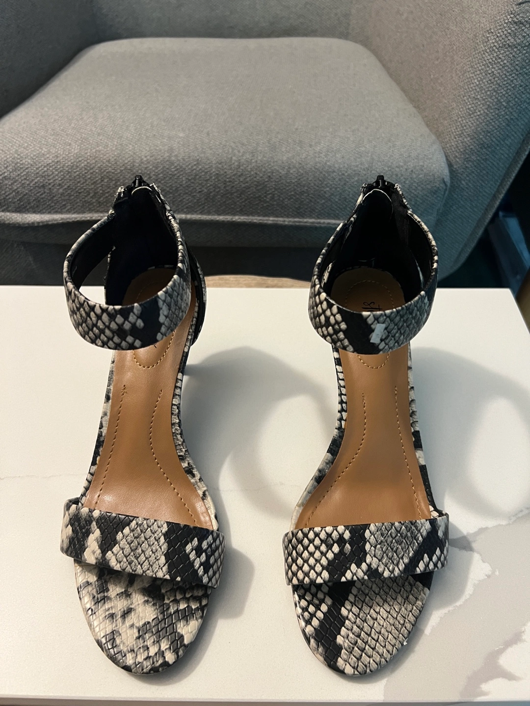 These stylish sandals in a snakeskin pattern. Ankle strap and zipper closure. The heels give off a simple, yet elegant touch, making it a great wear for date night. Brand new in a box Pick up in Etobicoke Cash only and price is firm Thank you so much