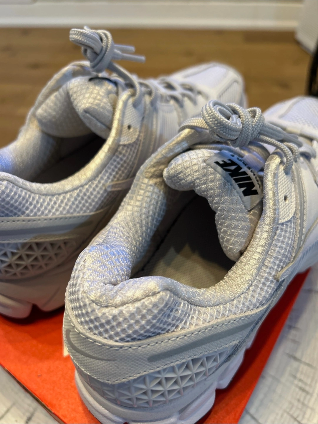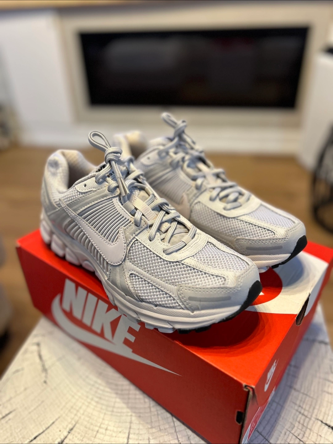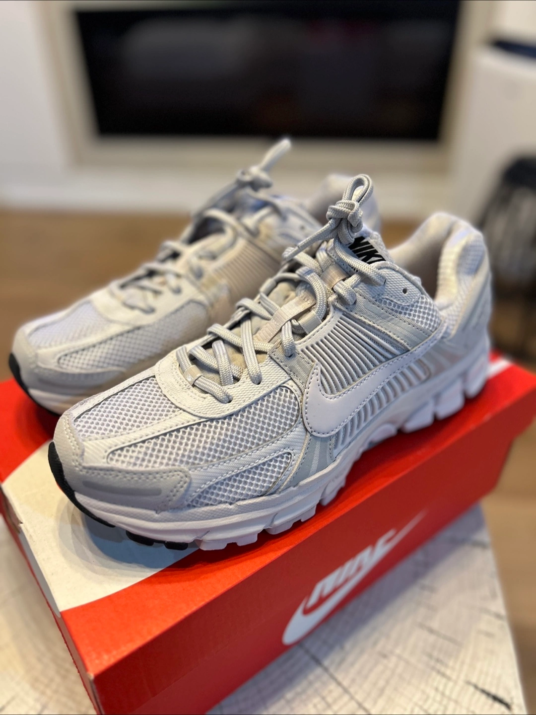Grey athletic shoes. Mesh detailing. Nike logo on the side and tongue. Placed on top of a red shoebox. A perfect shoe to take on an afternoon stroll. Nike Zoom Vomero 5 - Vast Grey/Black Sail DS in size mens size 10 Asking for $180 Pickup in Milton