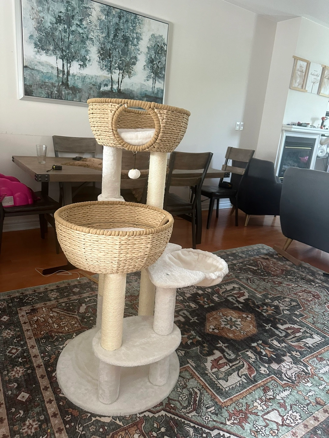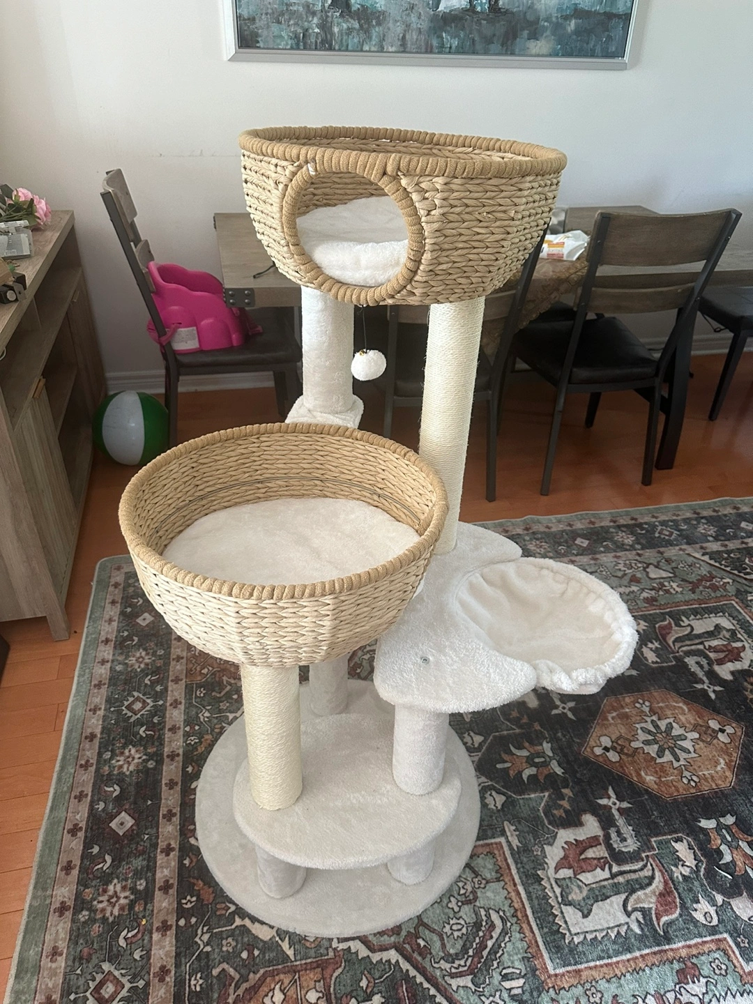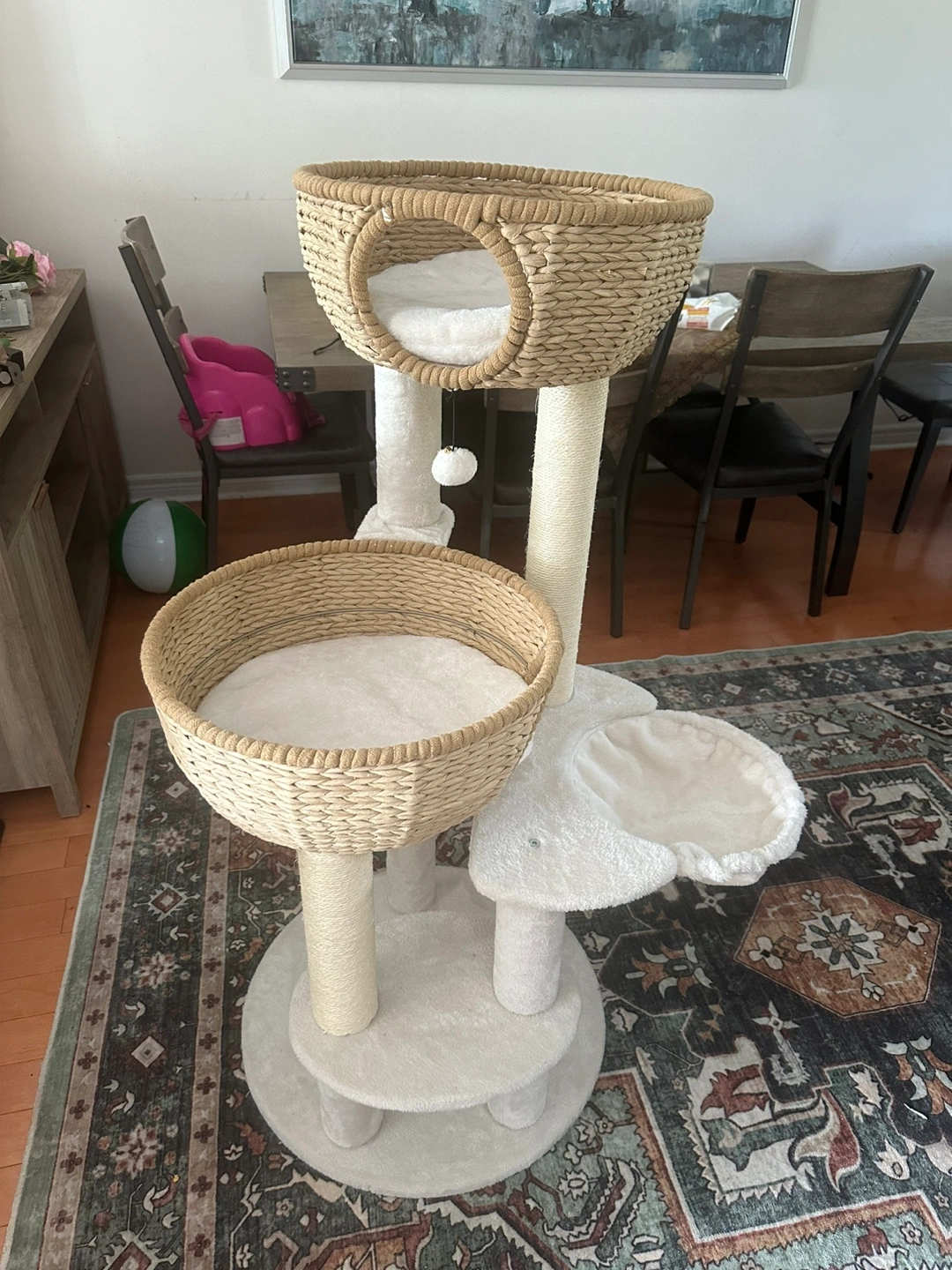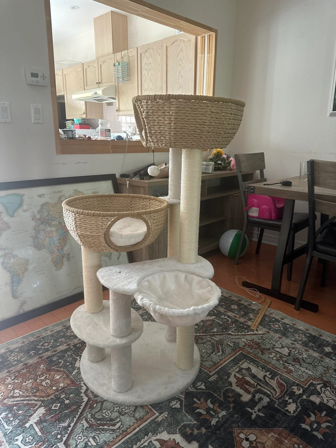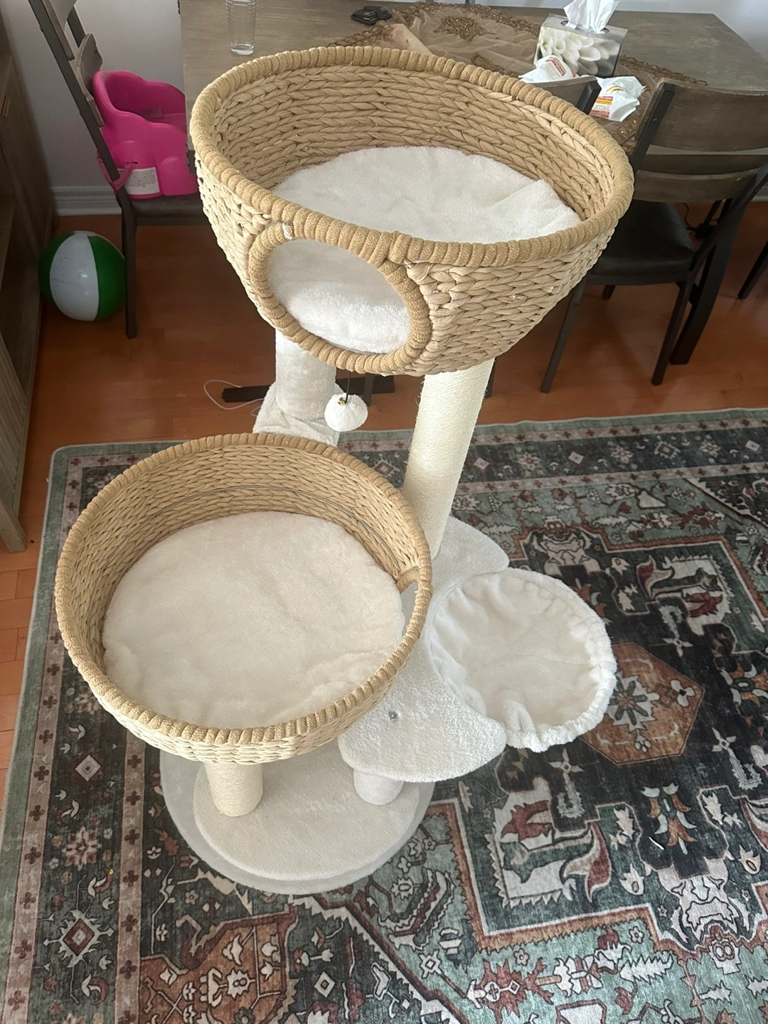 Cat tree with multiple levels. Made with multiple woven basket-like structures. It also has a platform with a soft, fuzzy material, for your cat to relax on. This cat tree would bring great joy and relaxation to your furry friend.