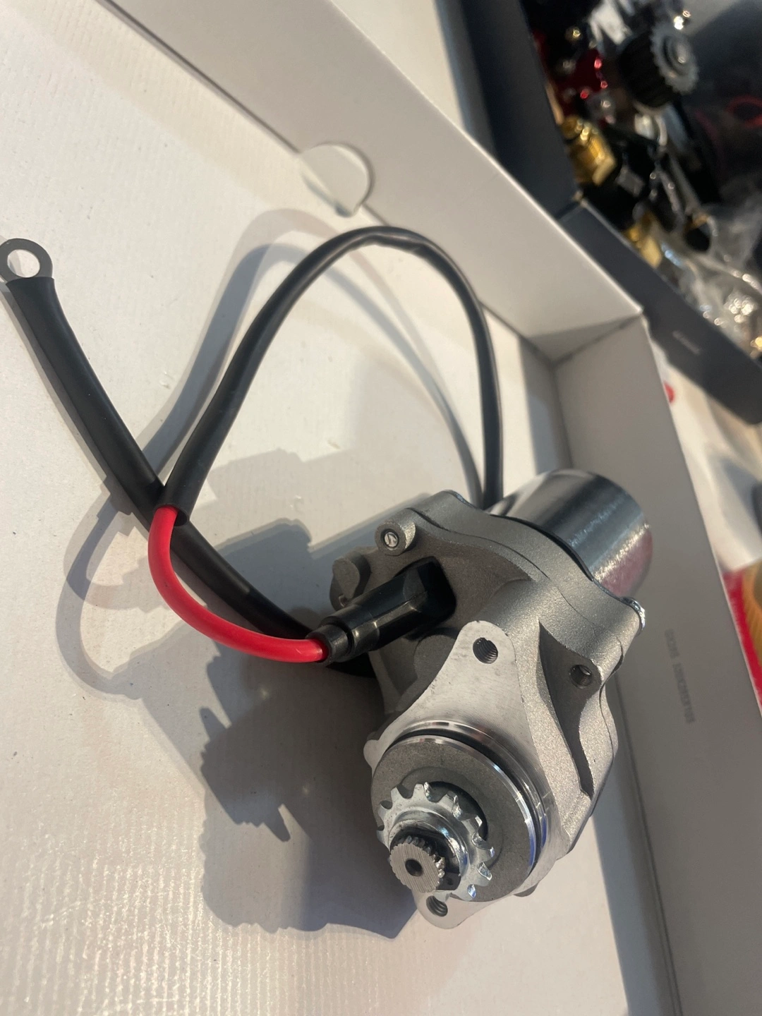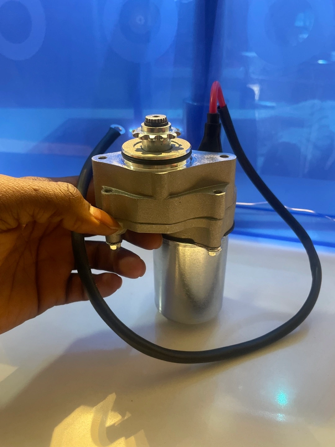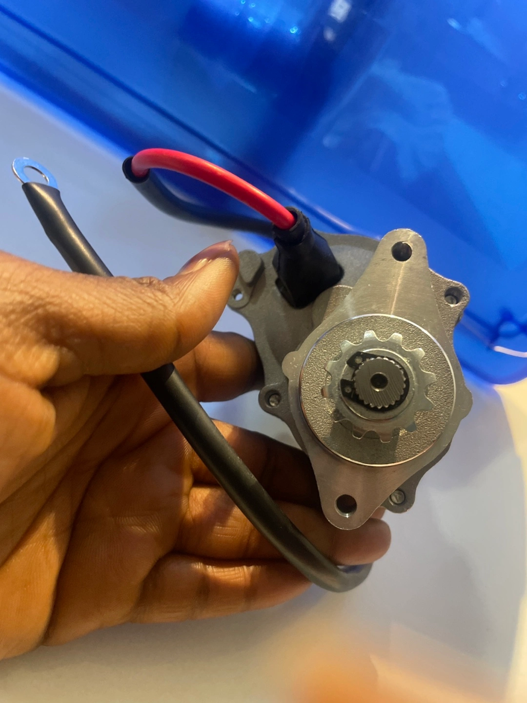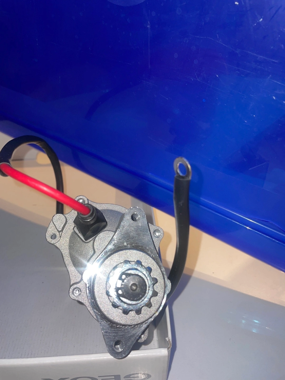 A metal electric motor starter. Features cables with connectors. Perfect for getting your vehicle running smoothly.