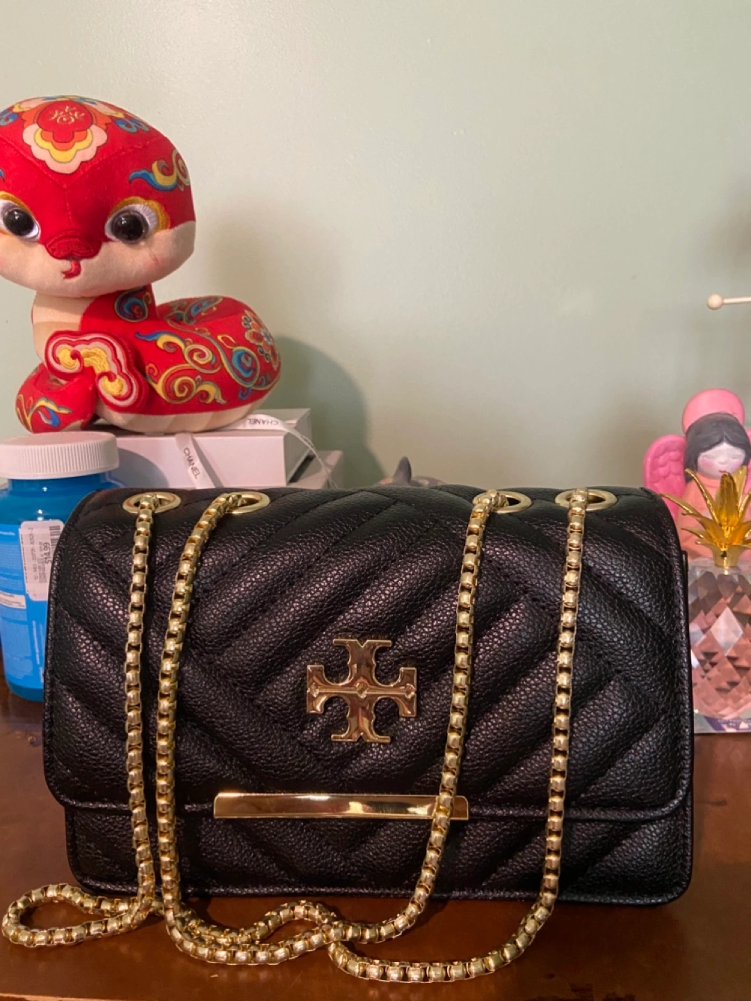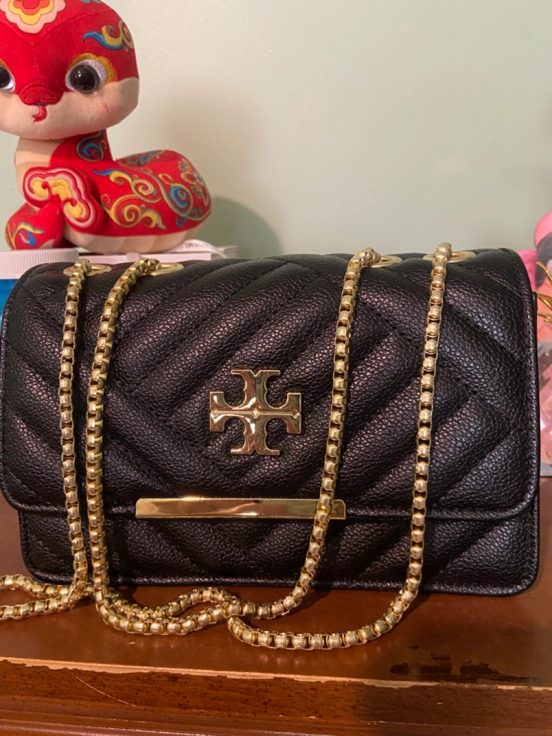 Inspired Black handbag. Gold chain strap. A gold Tory Burch logo. Great for carrying your essentials. $80