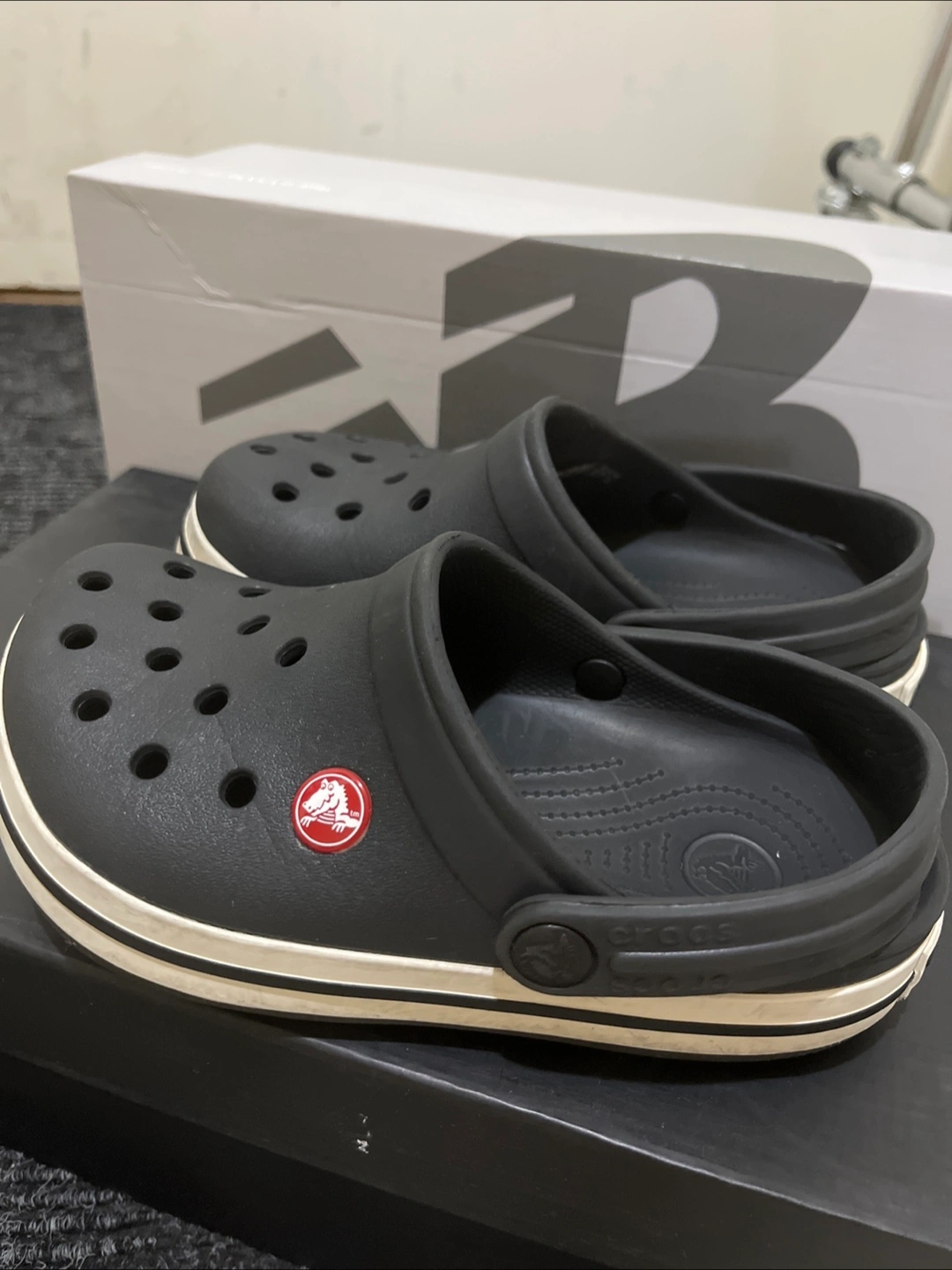 Classic black Crocs with white trim. Features several ventilation holes. Brand logo is visible on the side. Size J1 Cash, pick up only.