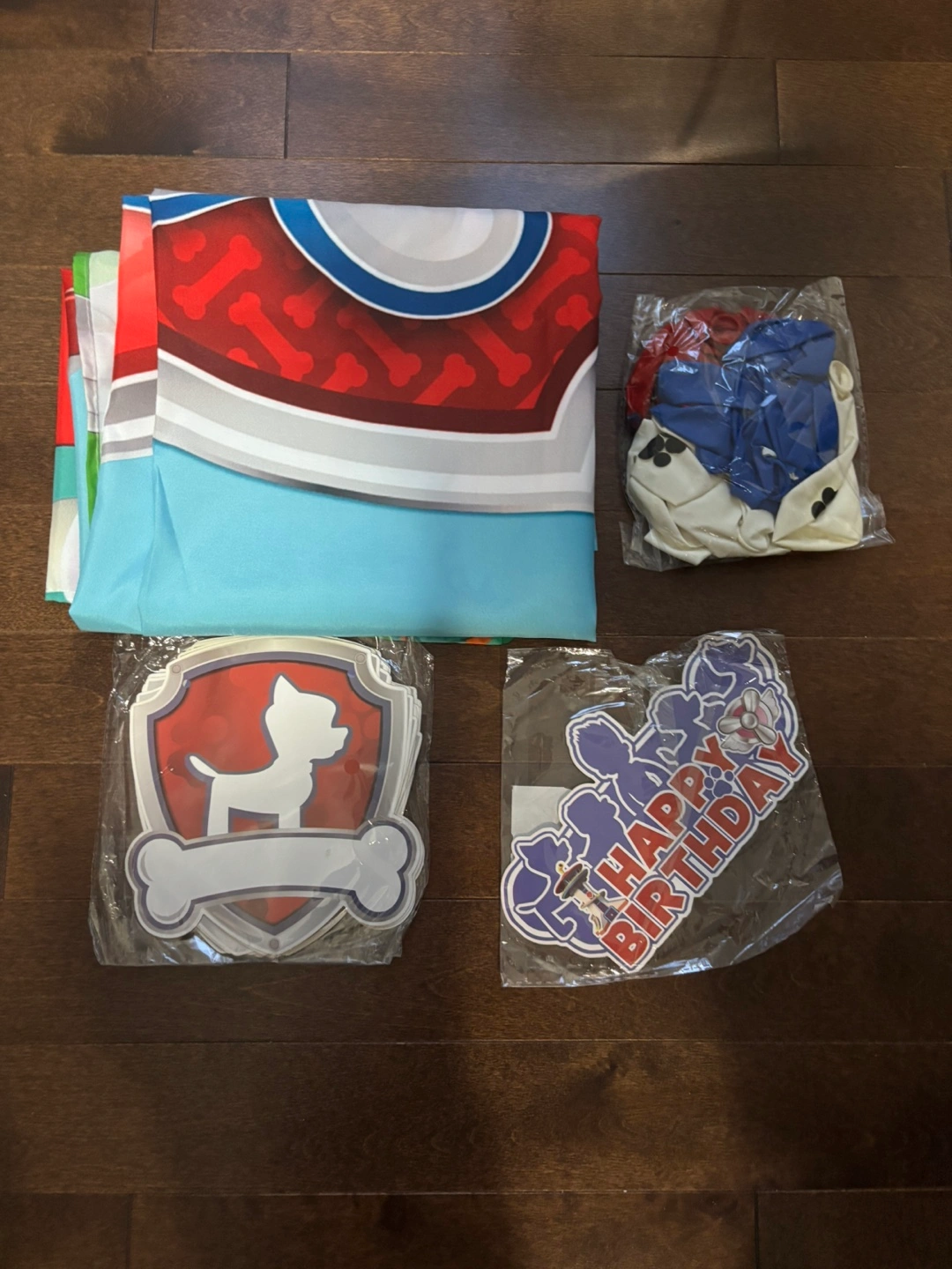 Bright colourful Paw Patrol party set. Features some characters from the show. Great for decorating a kid's birthday party, ensuring a fun atmosphere. Wall decorations , 3ft x 5 ft wall tapestry , cake topper and balloons