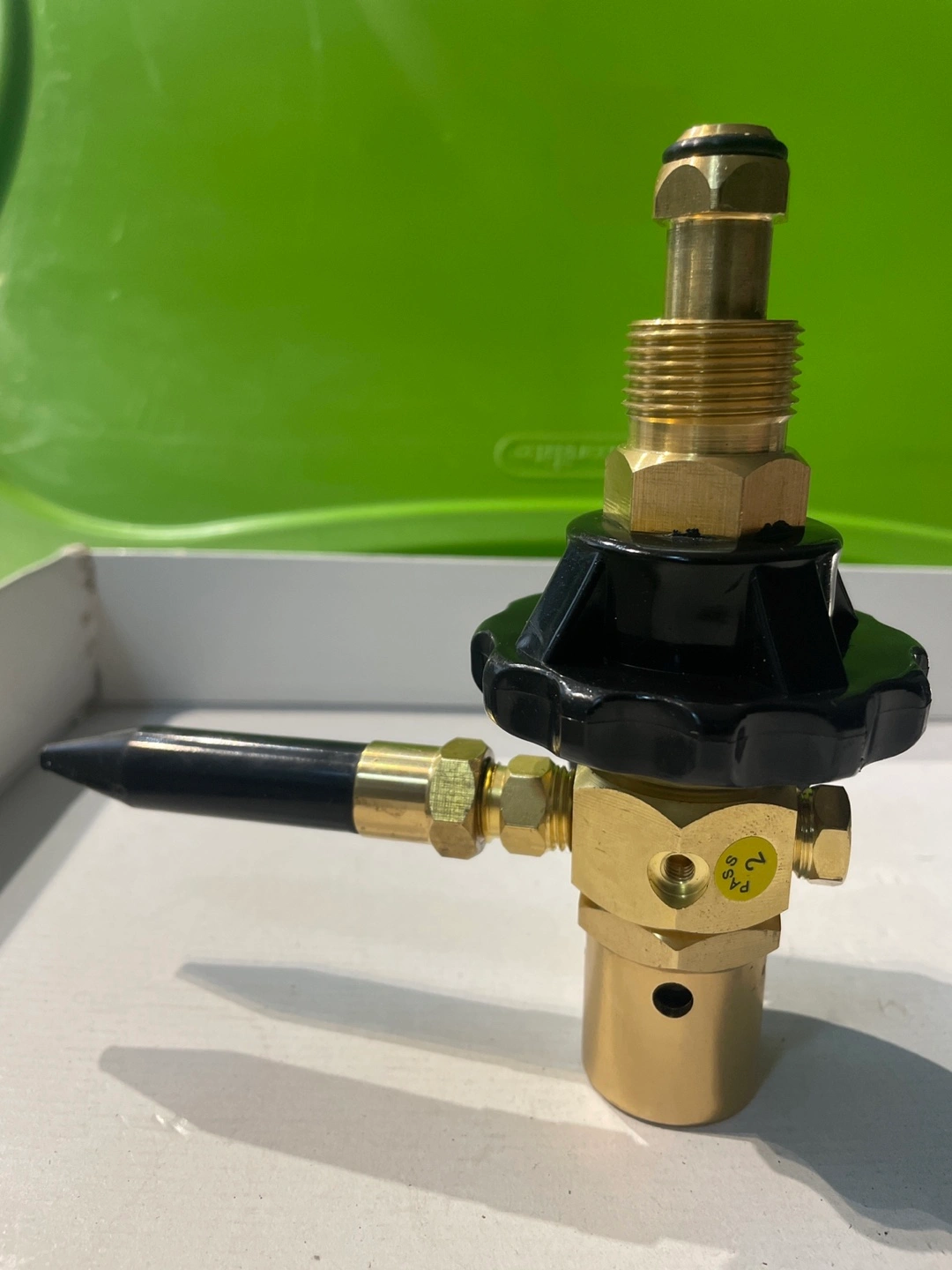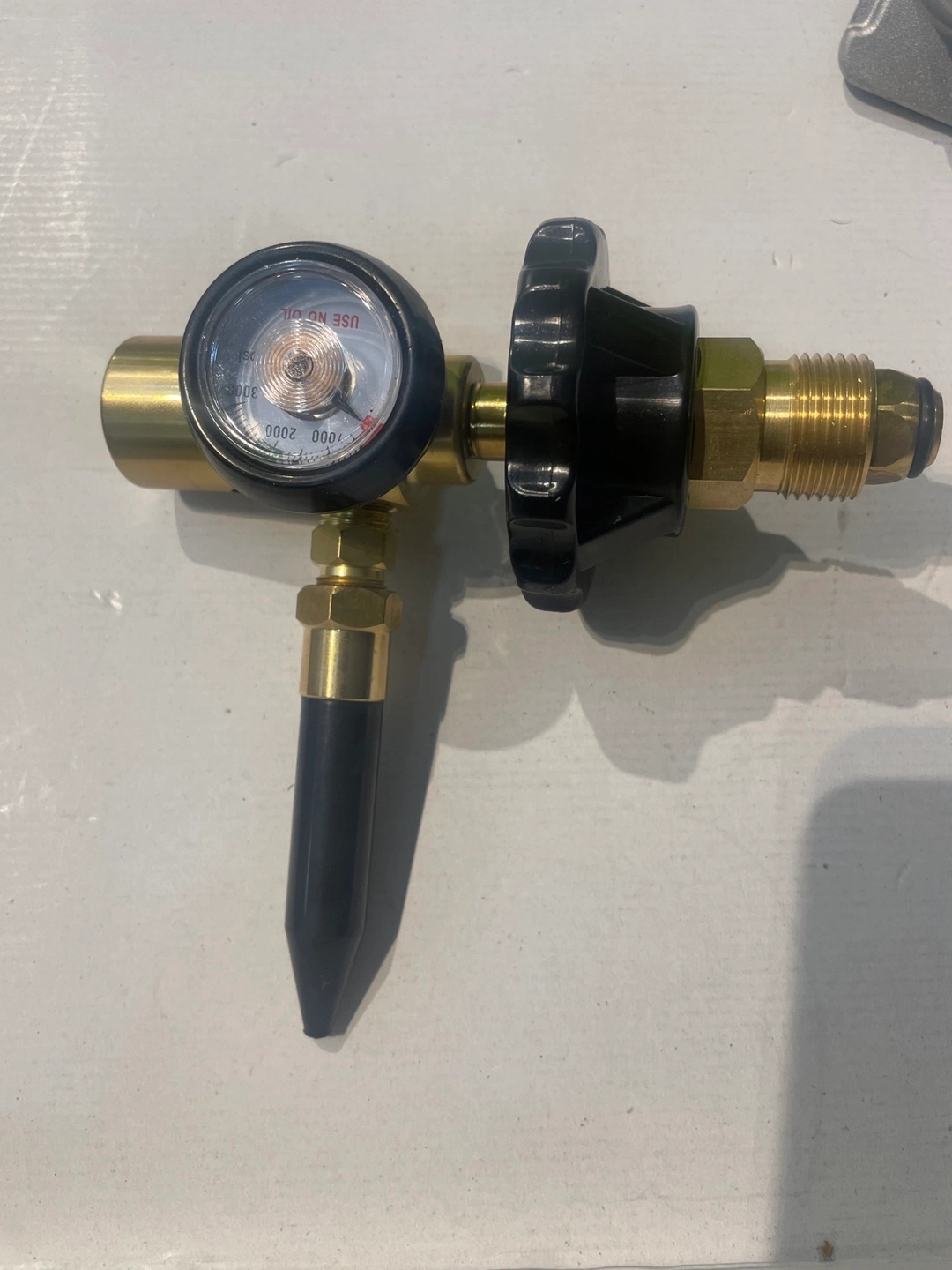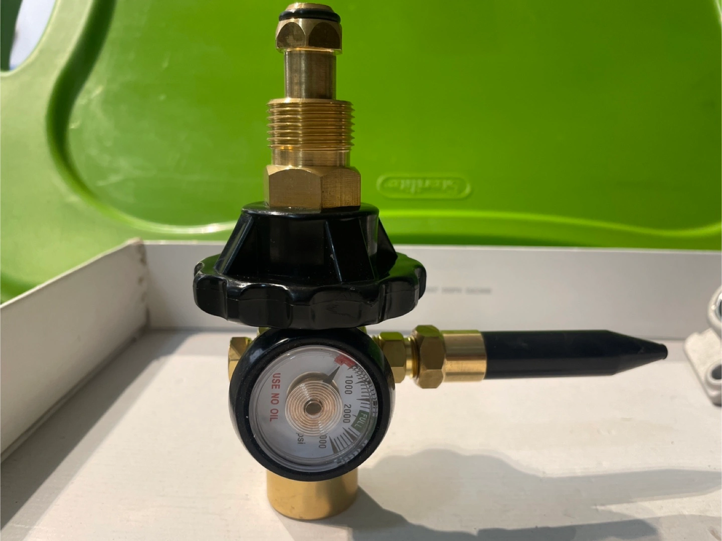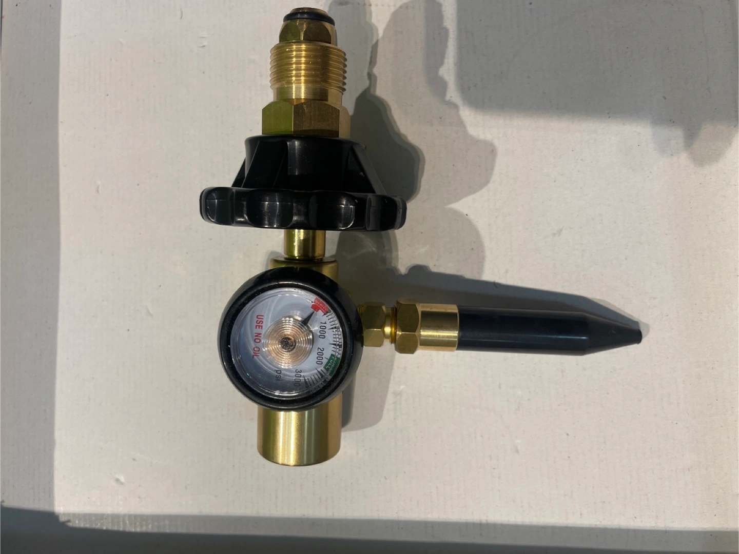 A brass pressure regulator for tanks like helium. Features a black dial and knob, with a pressure gauge. It has a small black nozzle and a threaded top. A nice tool to have in your toolkit for all sorts of projects this summer.