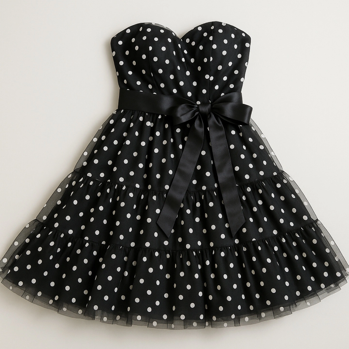 Gorgeous black dress with white polka dots. A bow adorns the waist of the dress. A strapless design. This dress can be worn for your next date or party, taking a moment for yourself to feel good in it.