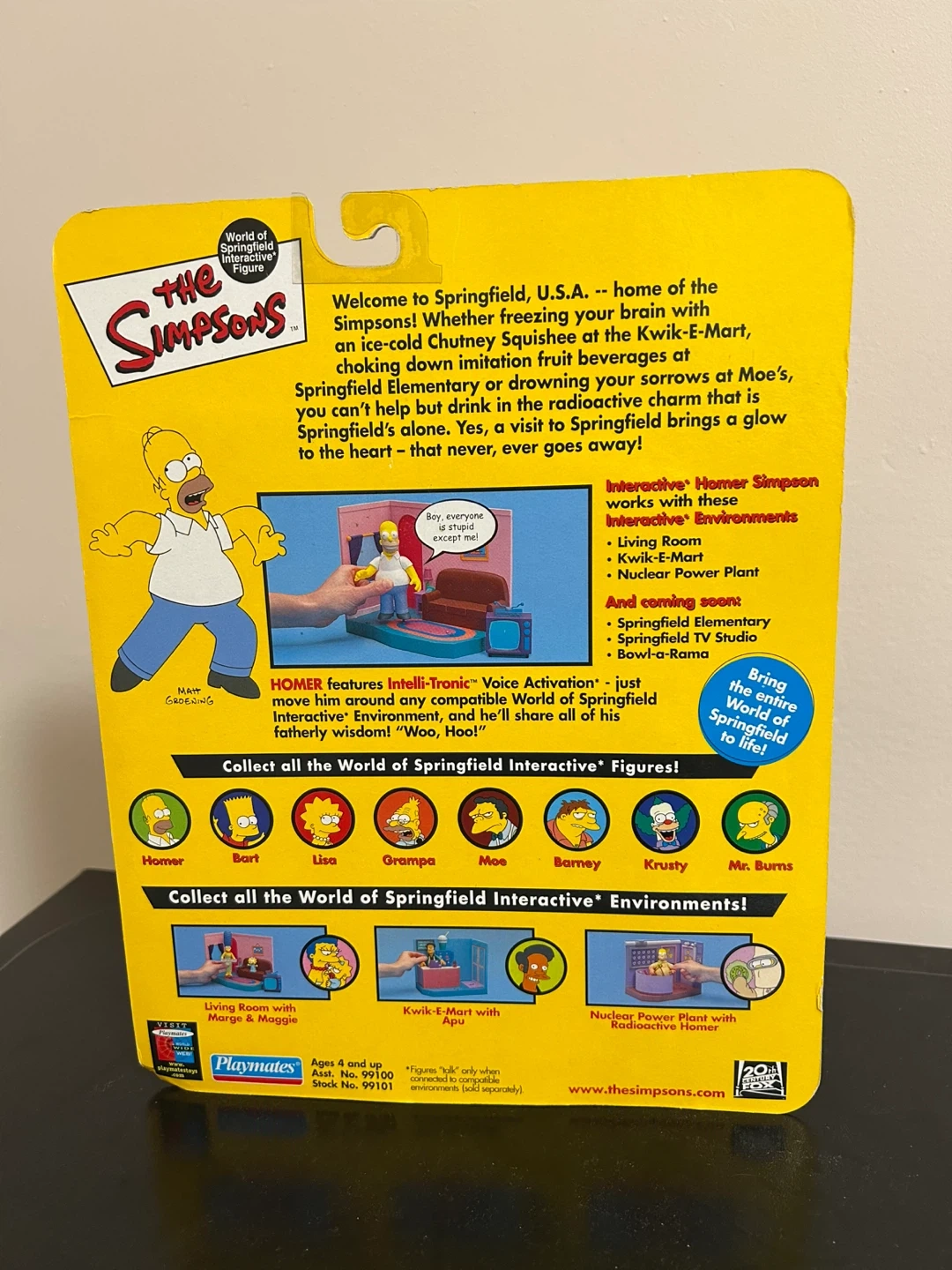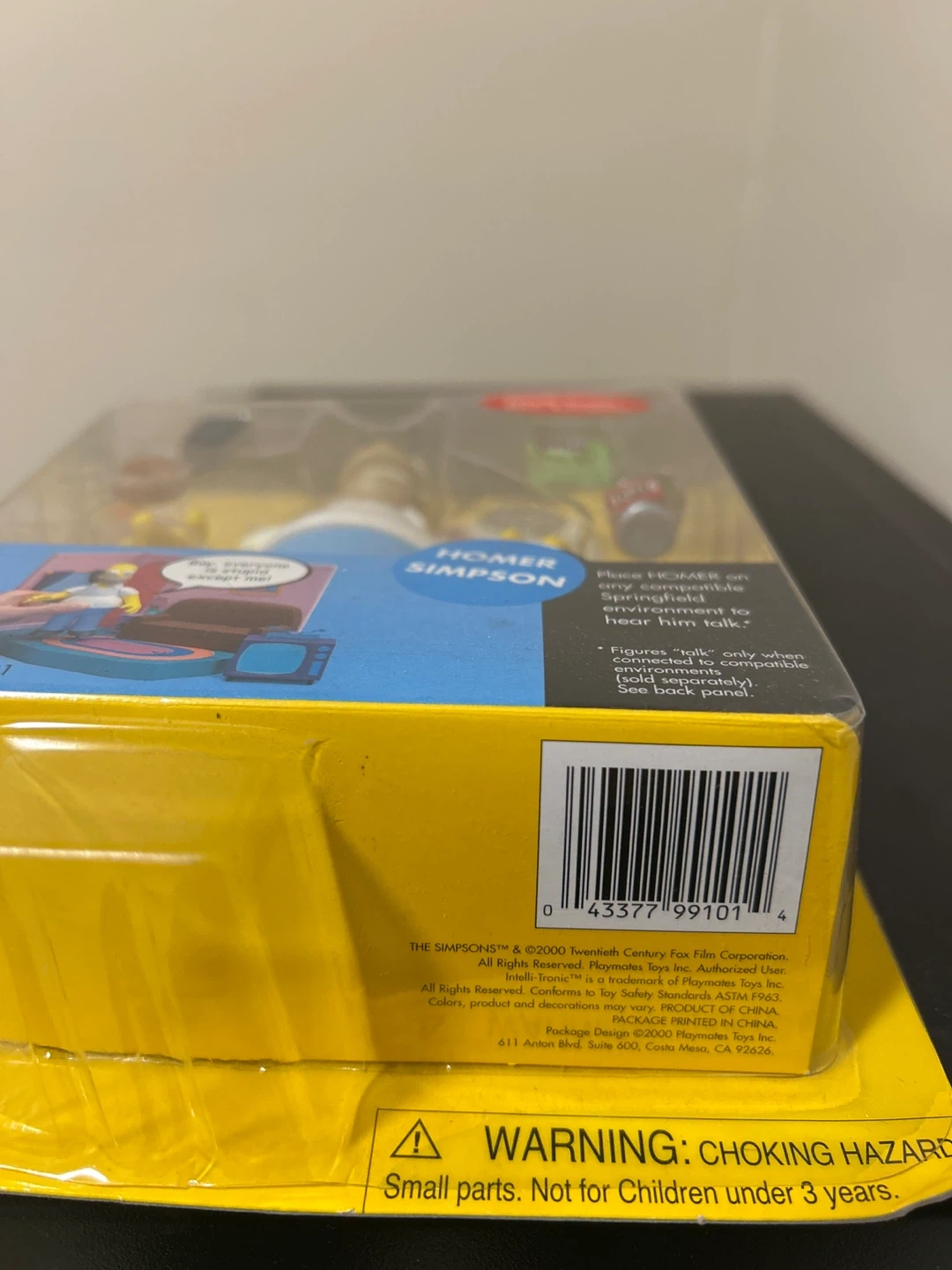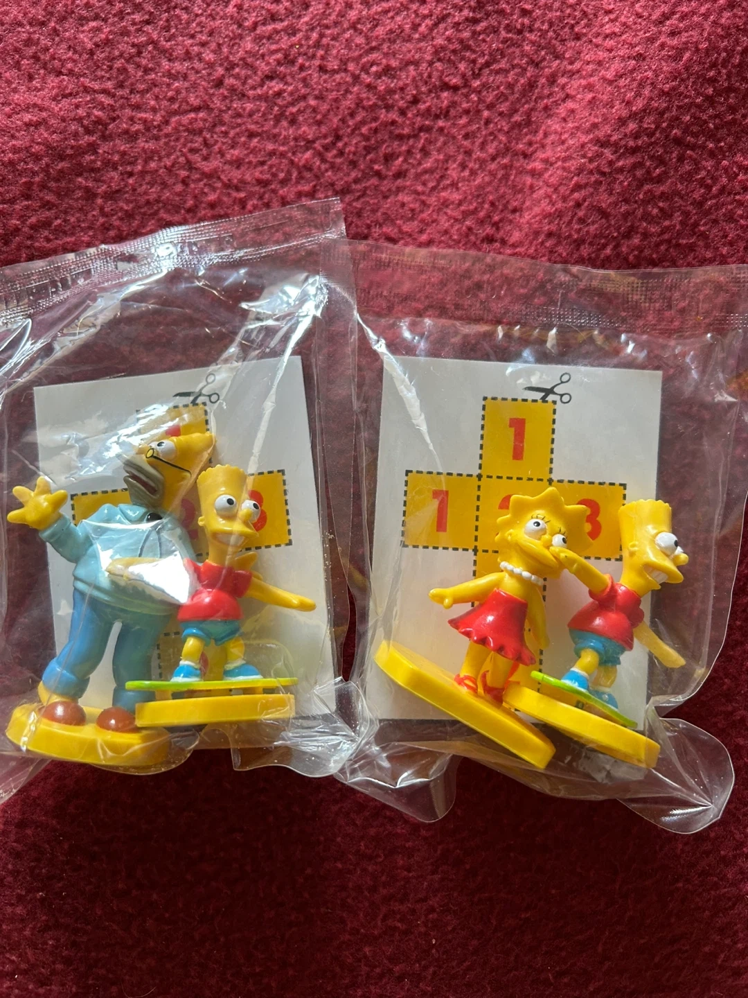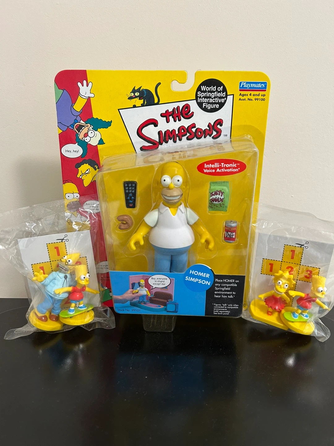 Homer Simpson figure, still in original packaging. Comes with some accessories, like a remote control and some donuts. Released by Playmates 2000. Package is in good condition. Plus….comes with two packs of sealed Kellogg’s Simpsons figures from 2003.