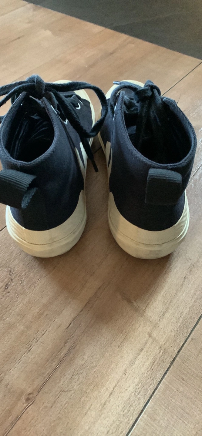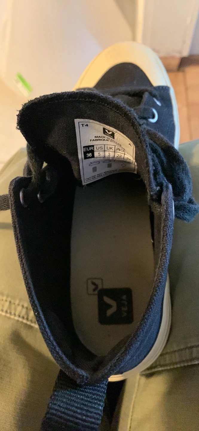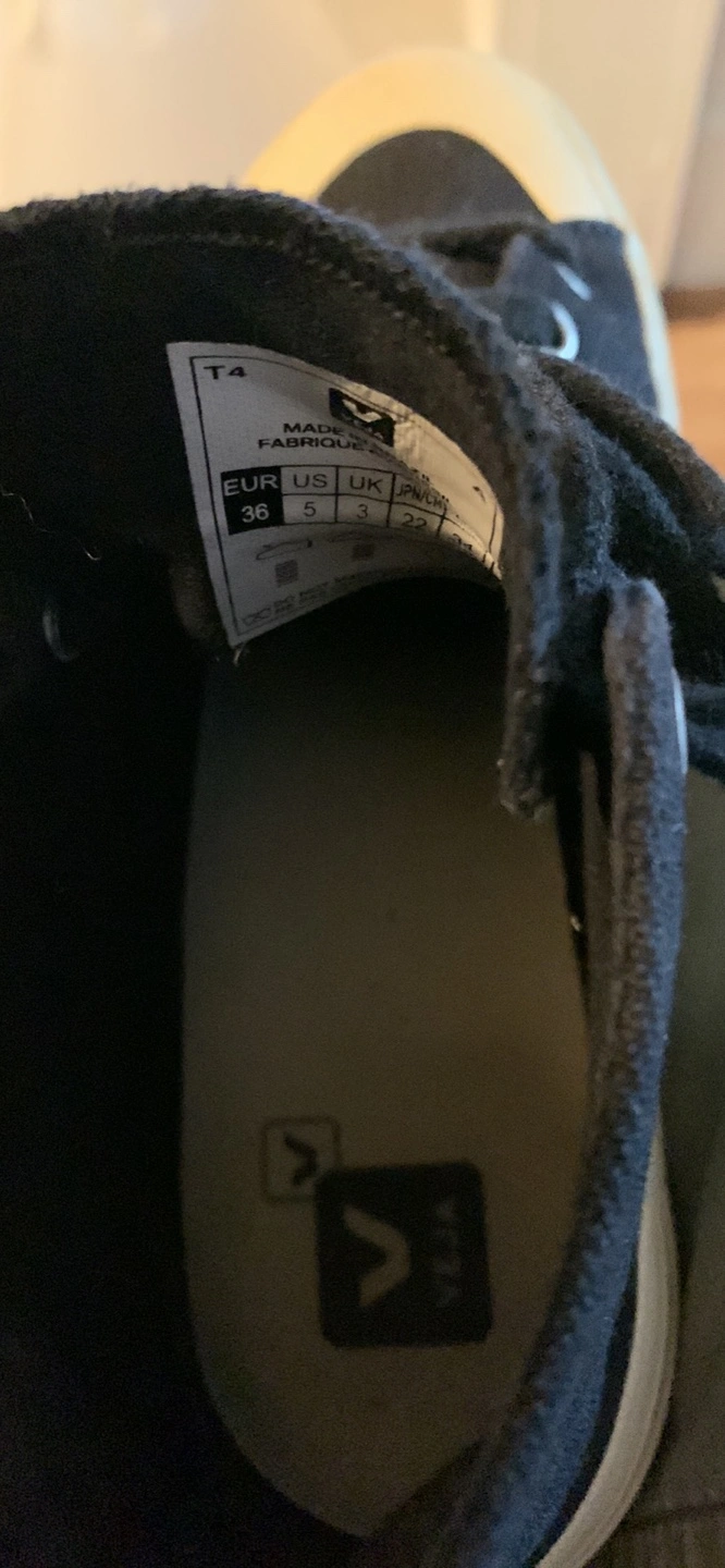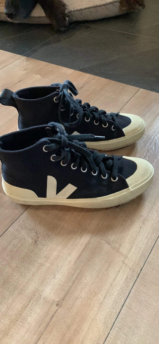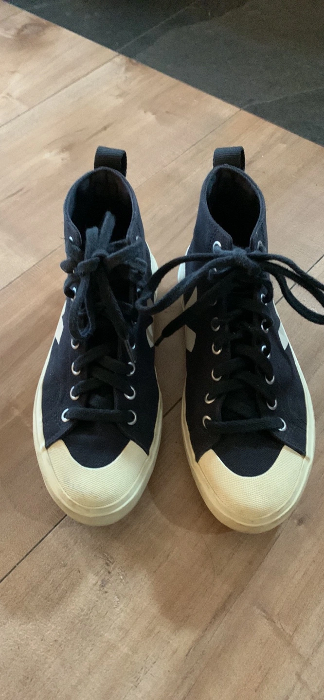 Veja high top sneakers. Blue canvas upper with off-white soles. White V on the sides. These sneakers are the perfect fit for your next walk.