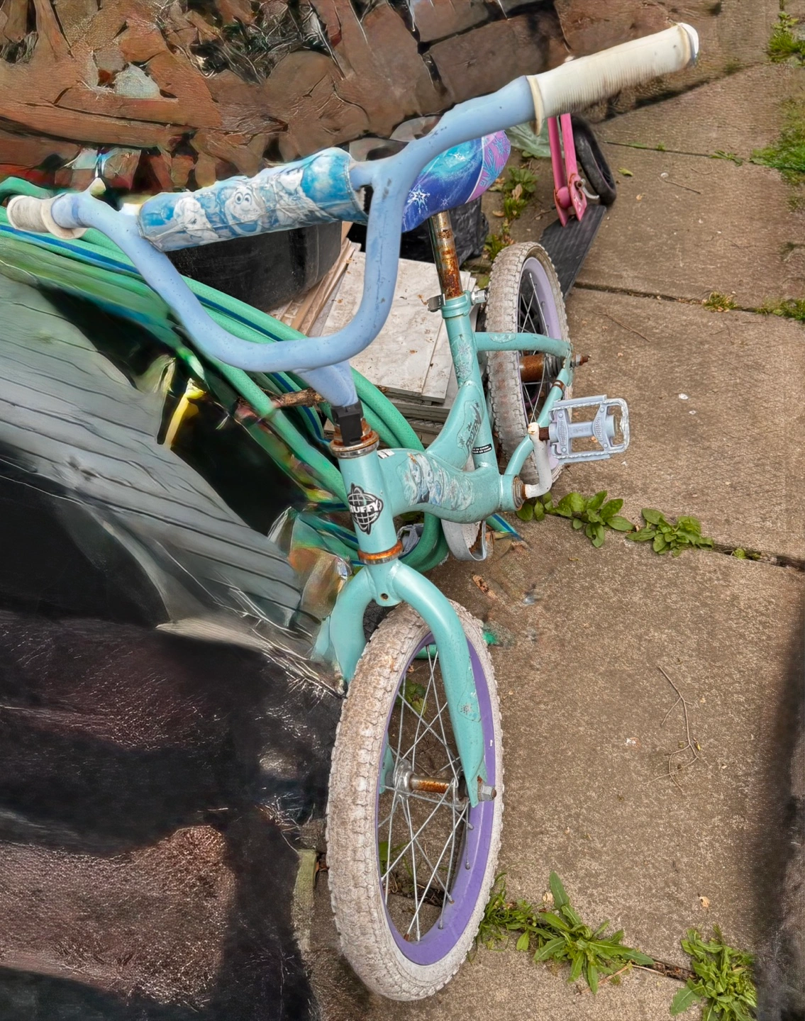 A beautiful kids bike with teal, purple and white accents. Features character details on the handlebars and frame. A great way to enjoy a sunny day. The tire needed a little repair so that was only $20 each. 2 available.