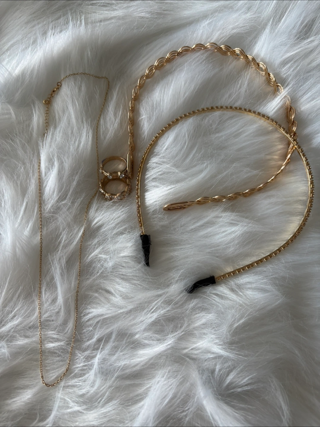 A collection of gold-toned jewelry. Includes a necklace, rings, and two headbands. Perfect for creating a charming, unified look.