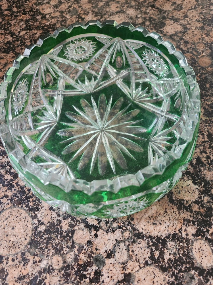 Gorgeous cut glass bowl. Beautiful green colour. Features a detailed, intricate design. This bowl is perfect for enjoying a bowl of soup on a cold day. $25. CALL SARAH 647 338 7177