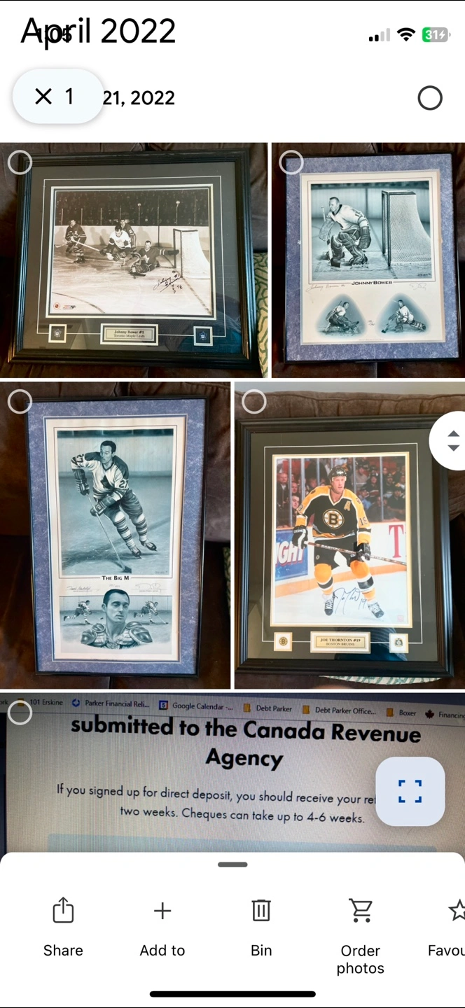 Both for $100 Four framed pictures of hockey players. One shows a player in a Boston Bruins uniform. There are also pictures of a goalie. Adding this to your home will brighten up the space and add a personal touch.