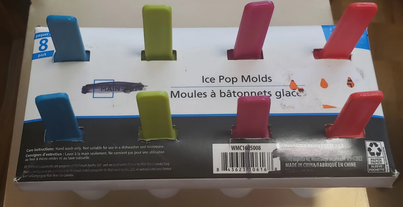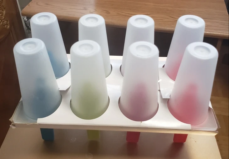 Set of eight ice pop molds, with colorful popsicle sticks. The molds are resting inside the original cardboard packaging. A perfect way to create tasty treats to enjoy during the warmer months.
