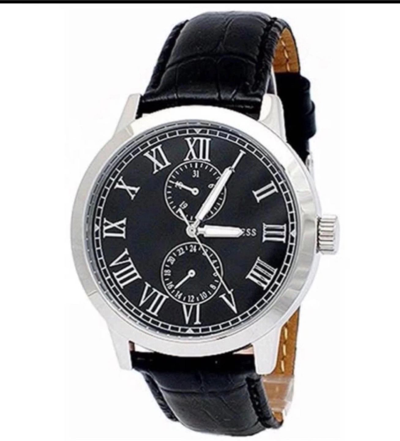 Guess men's watch W85043G1 Quartz Chronograph. Black leather strap. needs new battery. Features a round black face, with silver accents. Roman numerals adorn the face. Black leather strap. Pick up at Eglinton Ave east near Bayview.