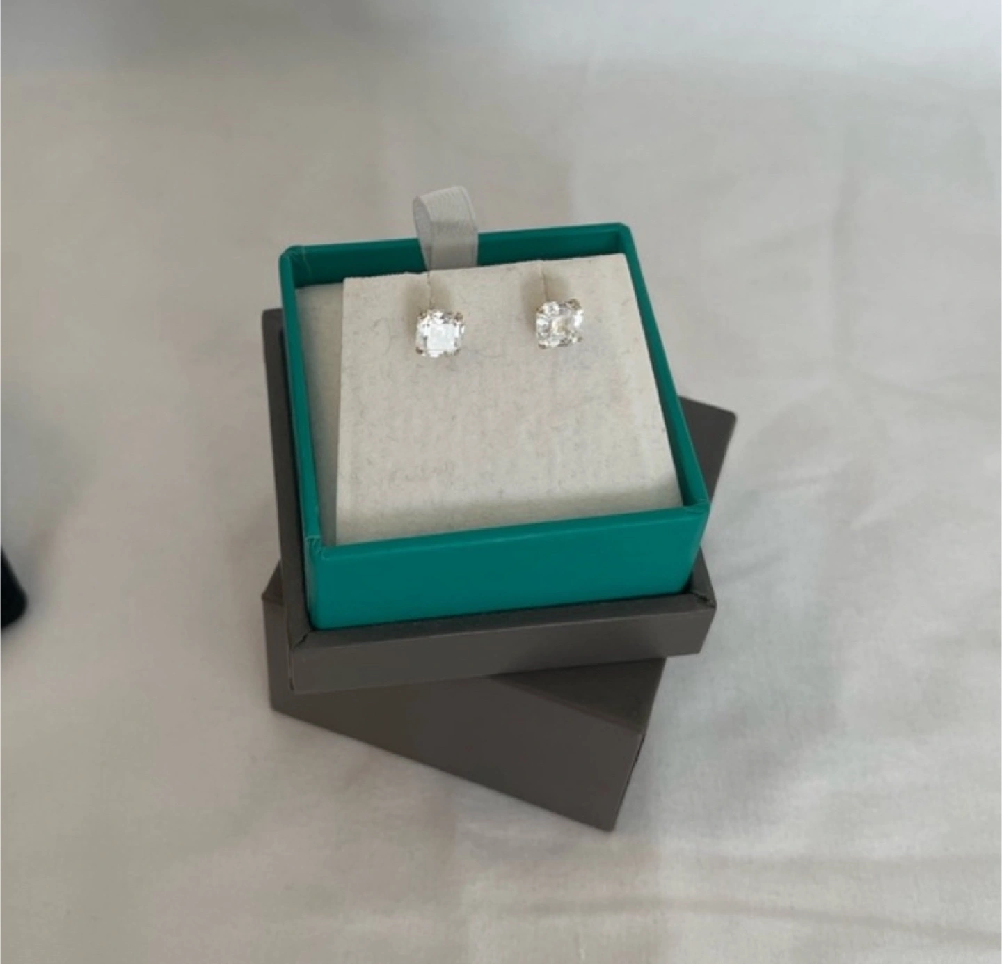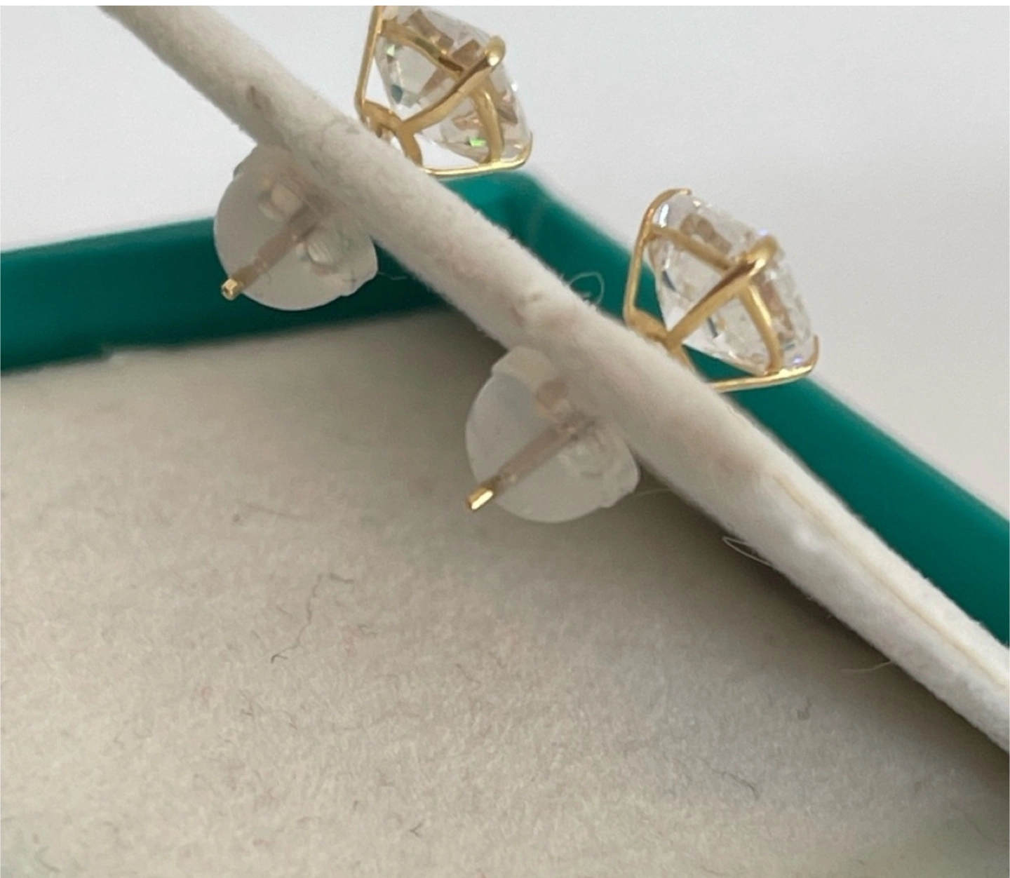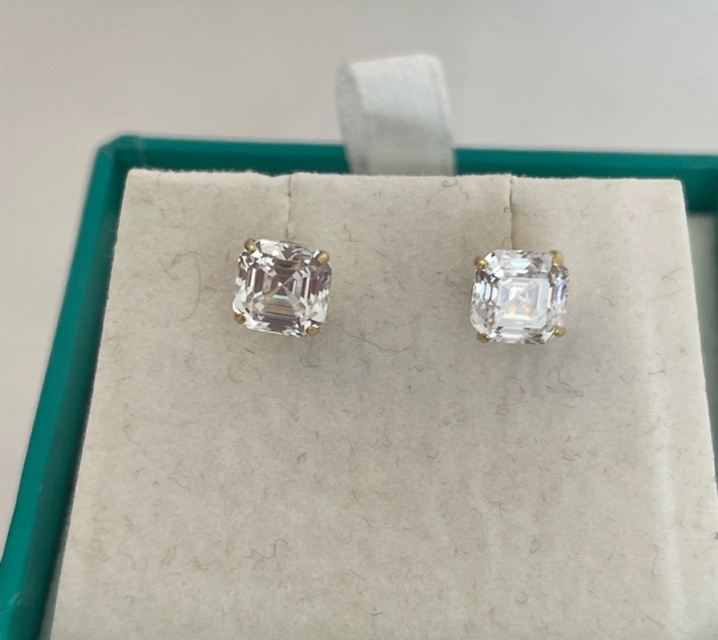 Brand New - 14K yellow gold White CZ Earring in cushion cut and has silicon with 14k tiny butterfly backing inside for safety lock and comfort wear cushion while wearing them every day . Great for gifting ! Box is not Included Pick up only or can do shipping.