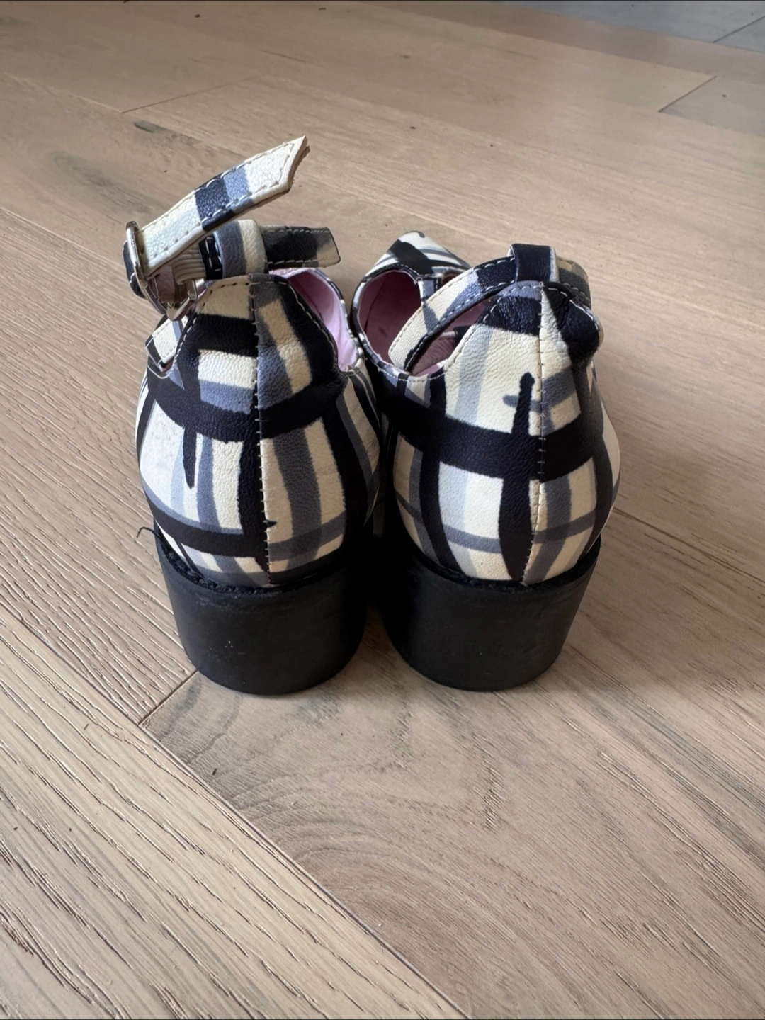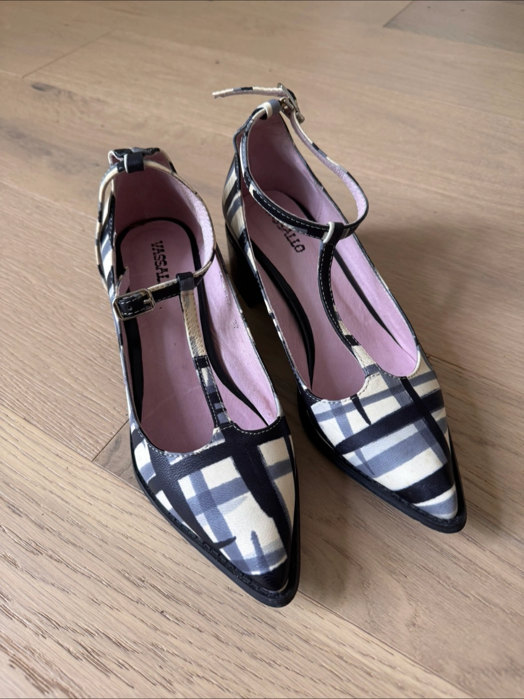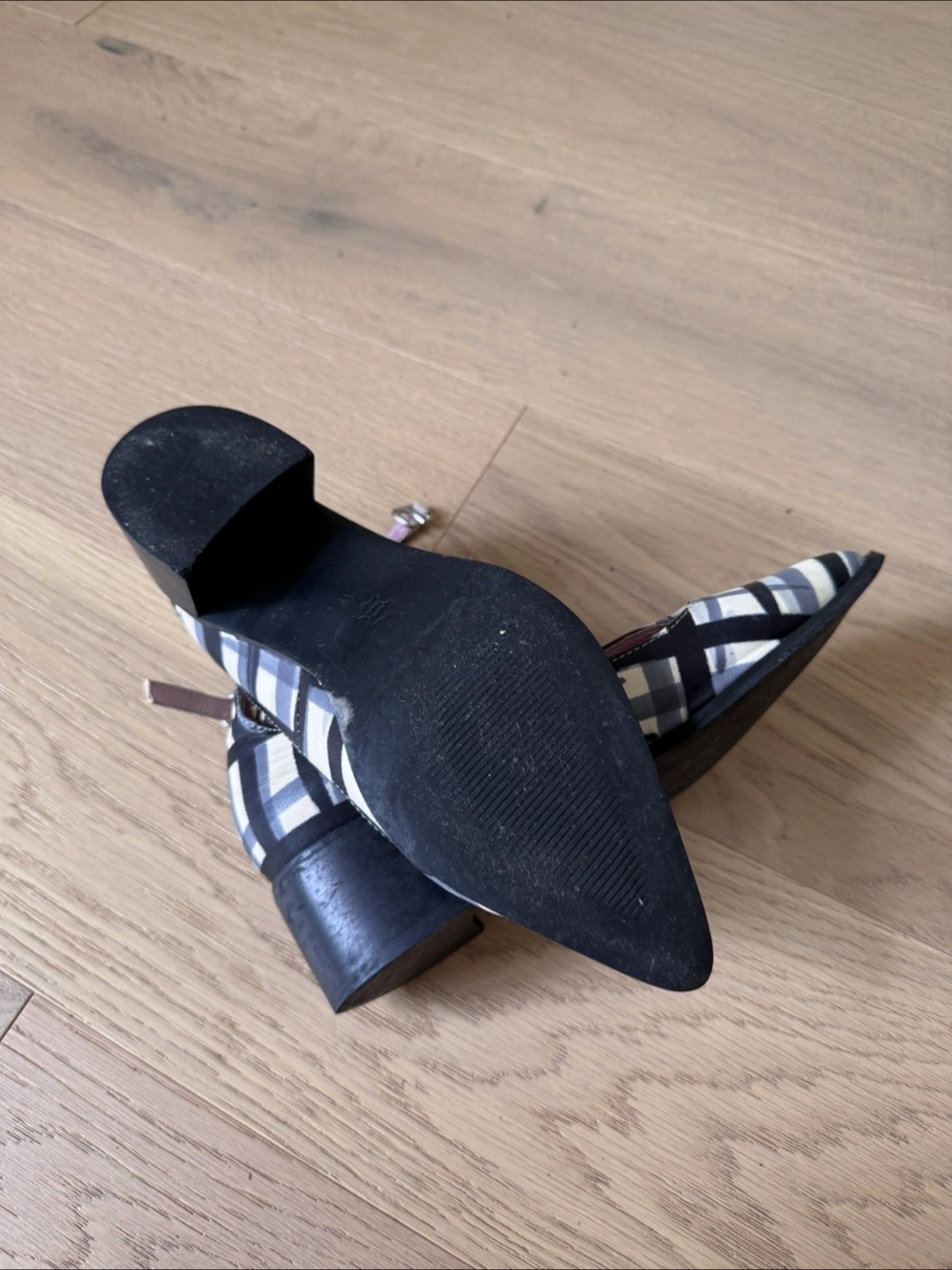 Stylish plaid patterned heels. Adjustable ankle strap. Pointed toe. Wear them to an event or on a casual walk. Only worn twice!