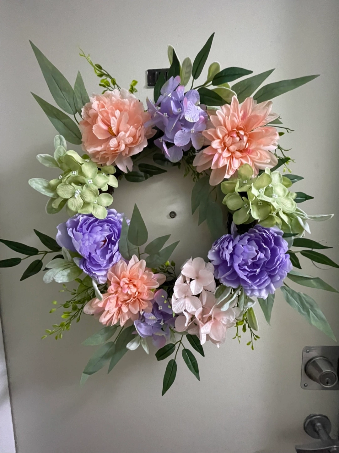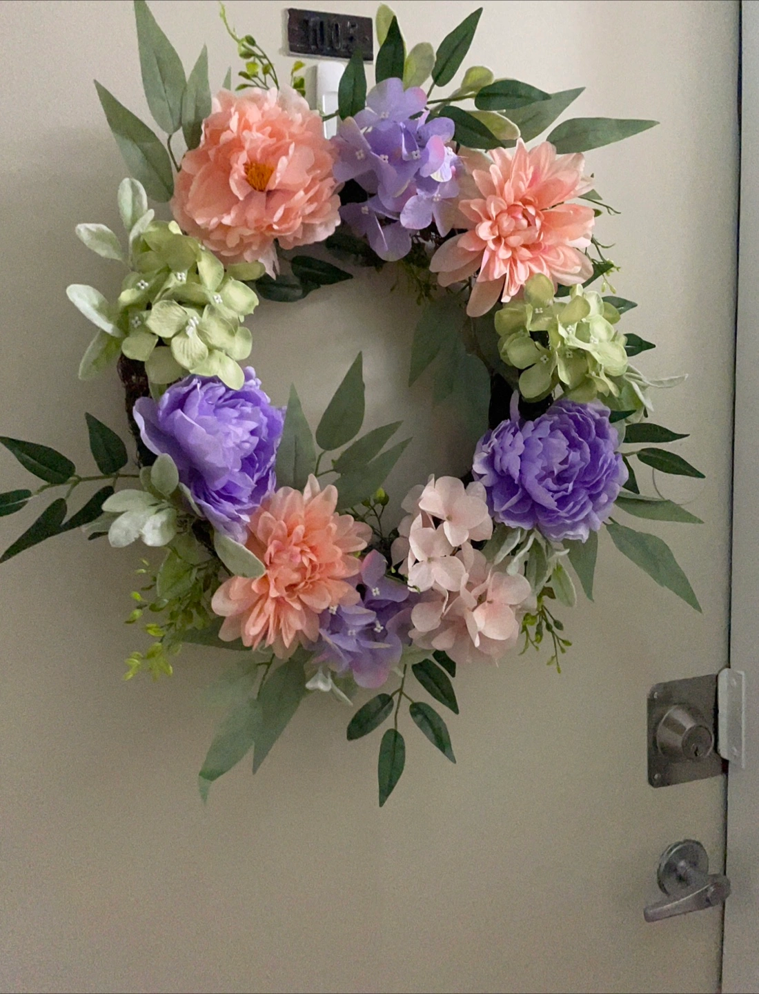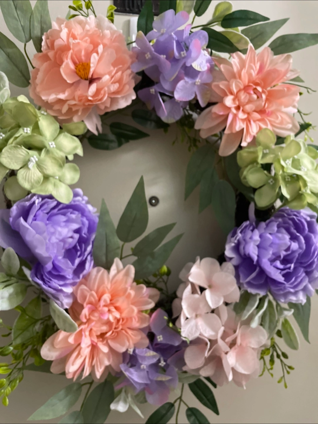 Lovely floral wreath. Features flowers of varied colours. Green leafy accents. A great decoration for your door, making it seem welcoming and cheerful.