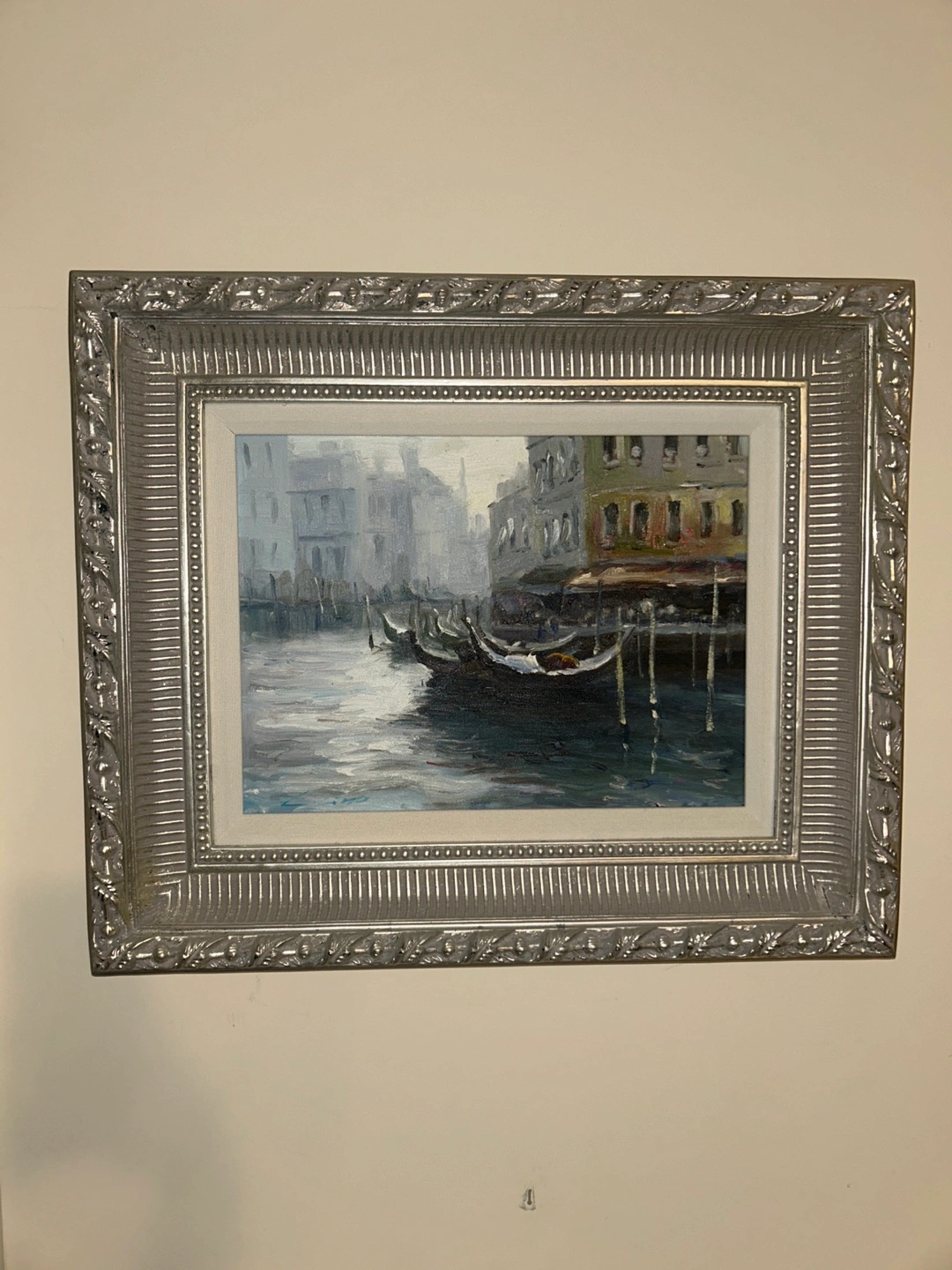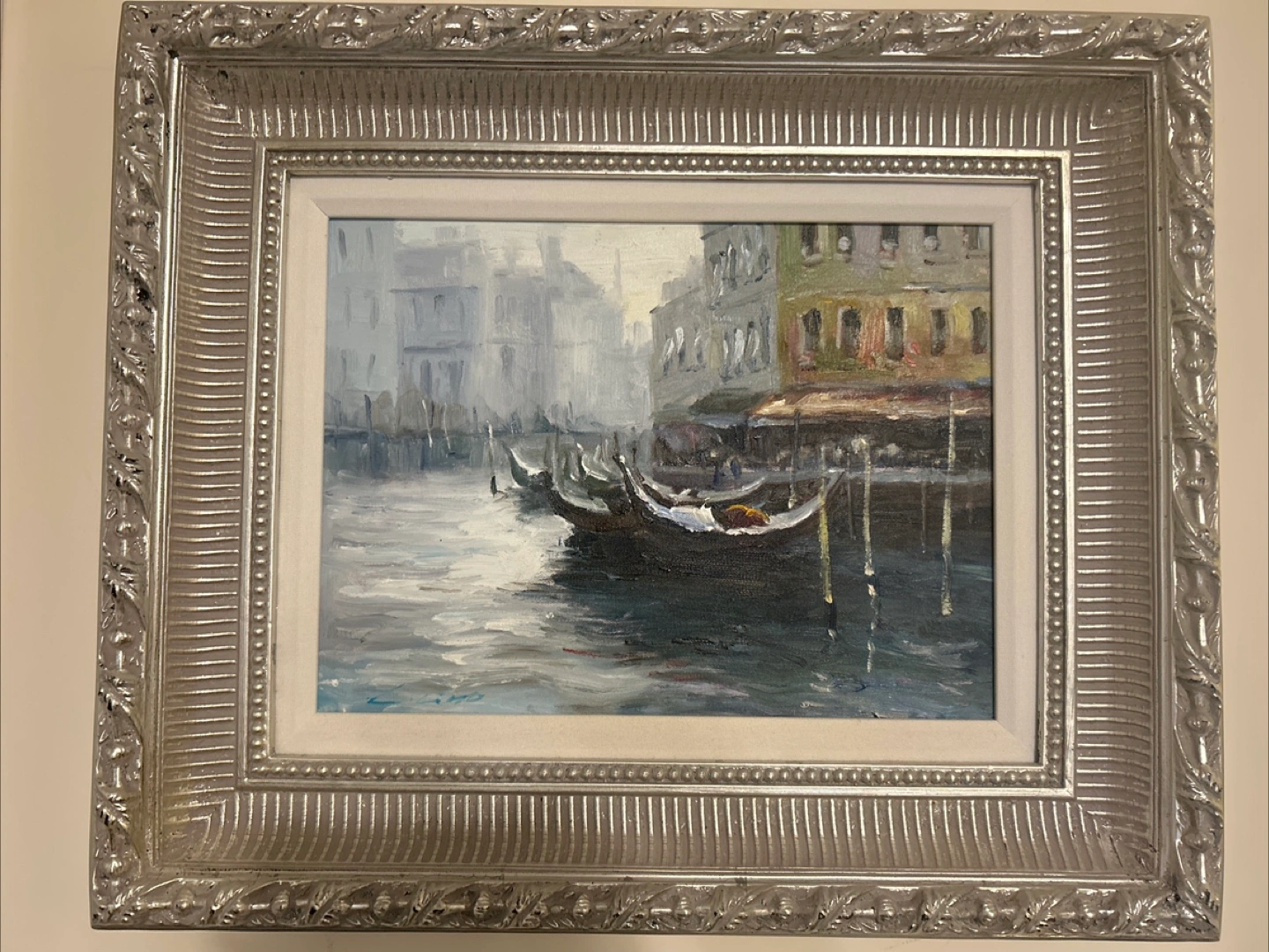 Beautiful framed authentic oil painting Venetian canal scene, featuring gondolas and buildings. The painting sits inside of a decorative silver frame with a white matting. This would be a perfect addition to any gallery wall, offers welcome but please be respectful Artists signature in bottom left corner